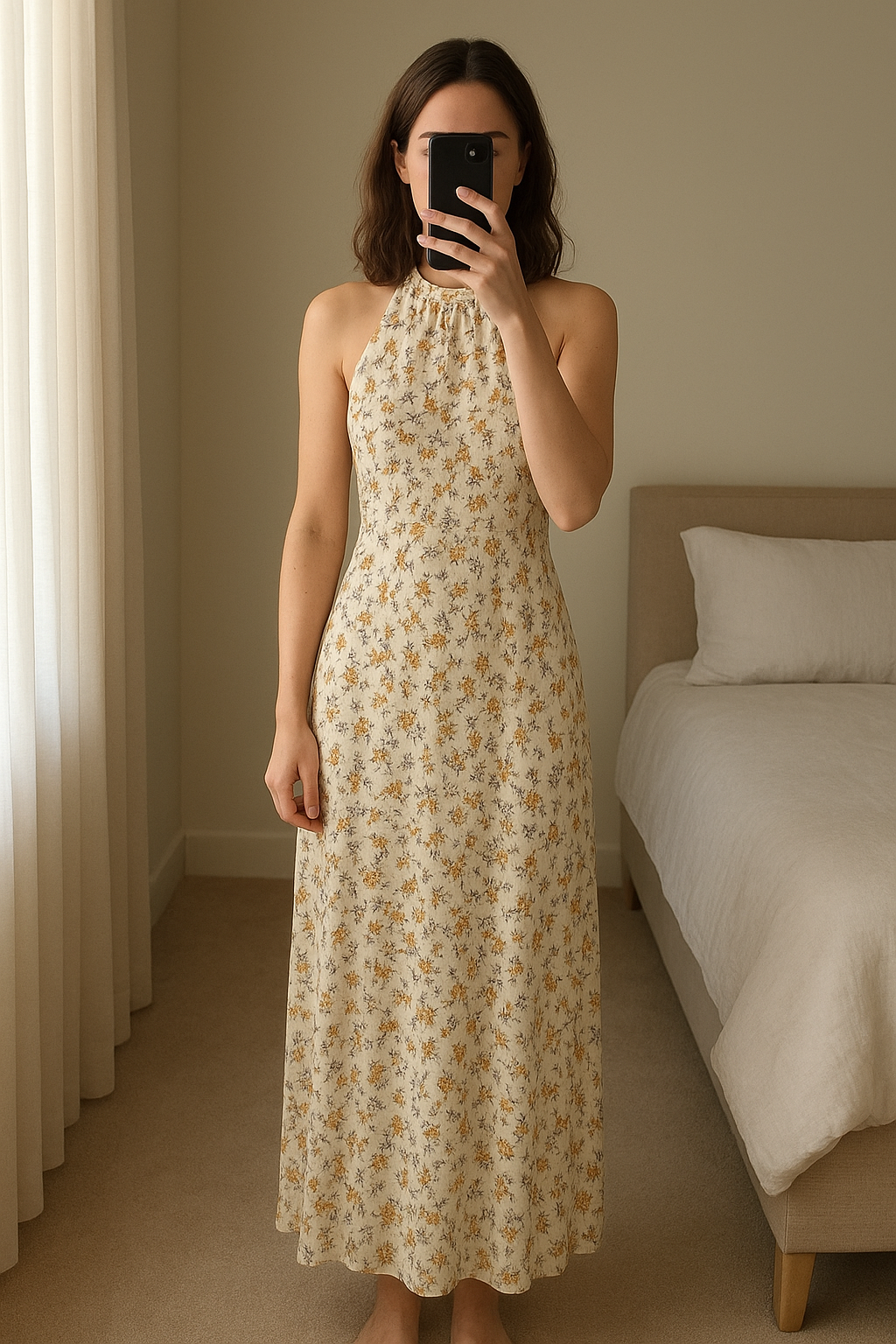 BNWT SilkFred maxi dress standing straight facing the camera, in a softly lit bedroom setting, with gentle natural light filtering through a window.