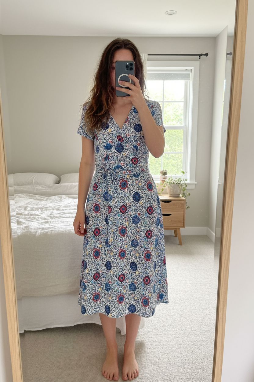 Boden blue dress UK 12R Vintage boho ditsy floral print wrap midi summer french girl cottagecore standing straight facing the camera, in a softly lit bedroom setting, with gentle natural light filtering through a window.