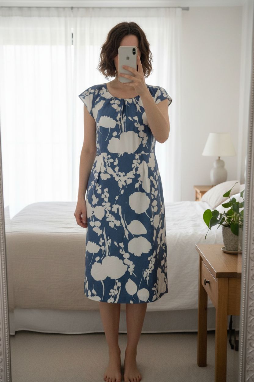 Boden Blue White Floral Shift Dress UK12 Smart Work Office Midi Dress silk quiet luxury occasion standing straight facing the camera, in a softly lit bedroom setting, with gentle natural light filtering through a window.