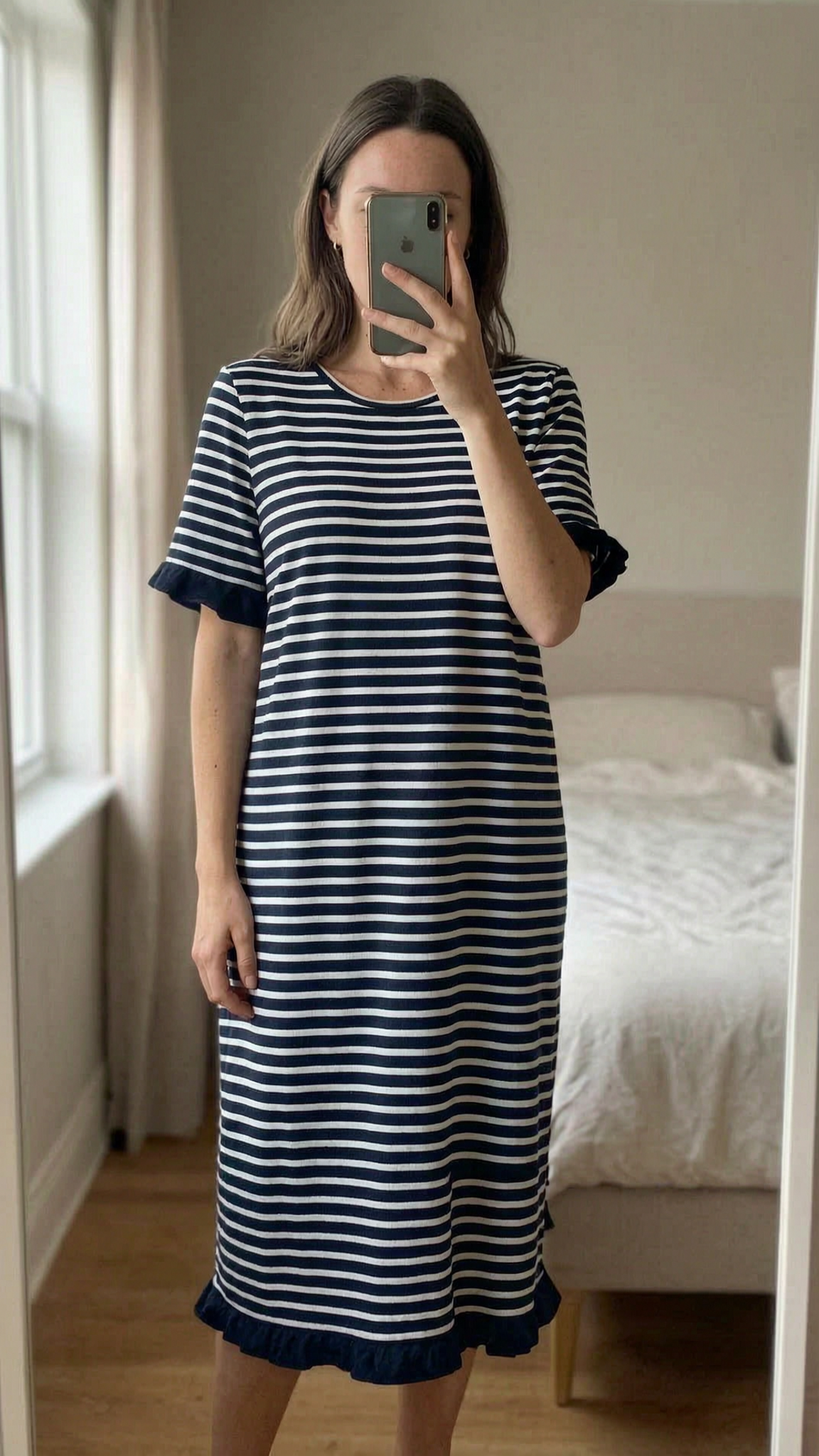 Boden Striped Midi Dress UK14 Navy Breton Ruffle Casual Chic standing straight facing the camera, in a softly lit bedroom setting, with gentle natural light filtering through a window.