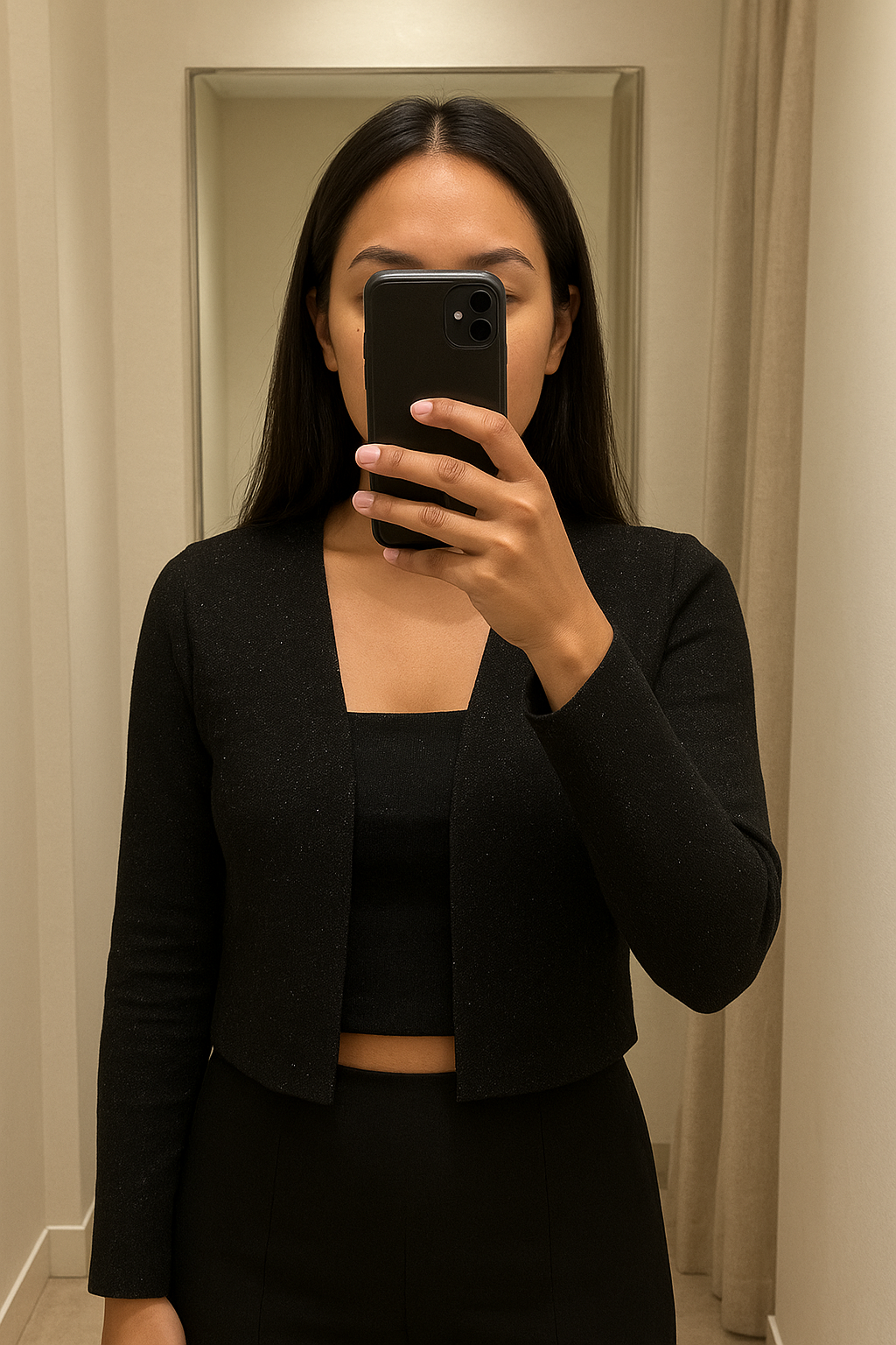 Une personne en Boléro noir à paillettes Phildar L debout, face à la caméra, dans une cabine d’essayage de style boutique avec un miroir et une décoration neutre.