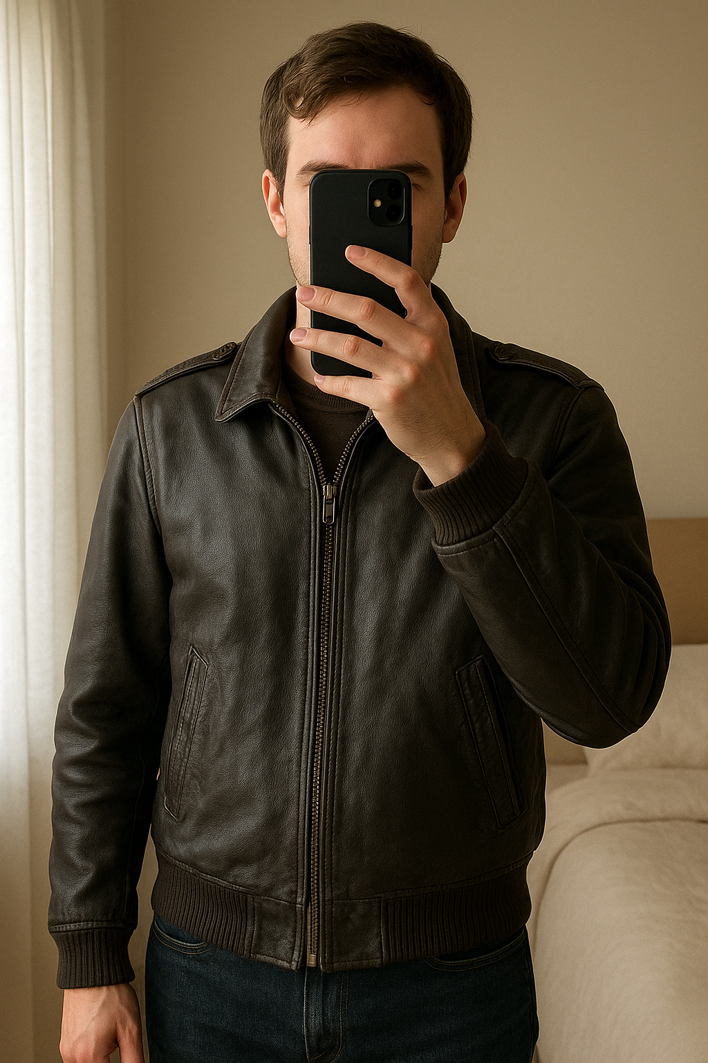 Bomber vintage 100% cuir debout, face à la caméra, dans une chambre à la lumière douce, avec une lumière naturelle filtrant par la fenêtre.