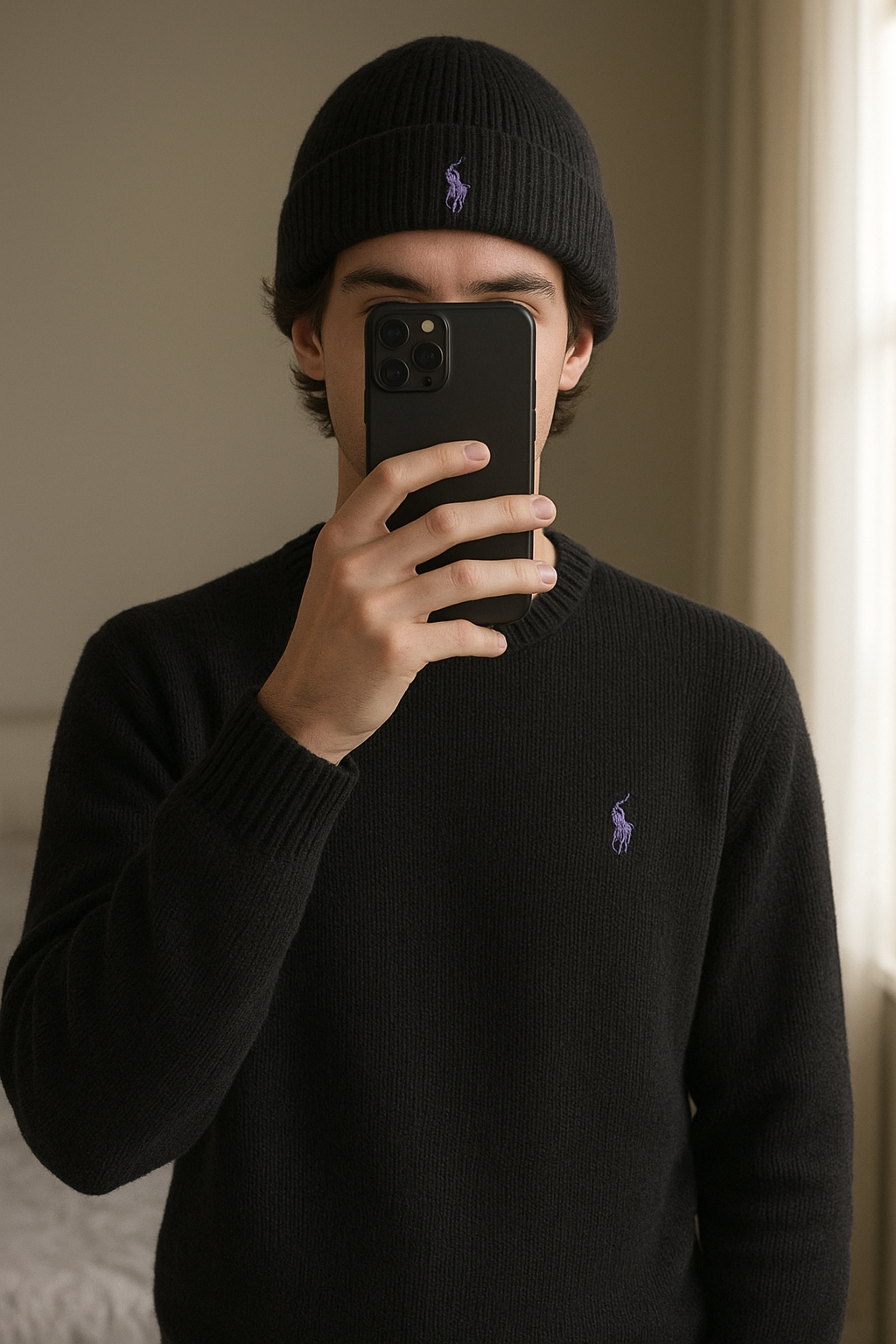 Bonnet Ralph Lauren noir logo violet debout, face à la caméra, dans une chambre à la lumière douce, avec une lumière naturelle filtrant par la fenêtre.