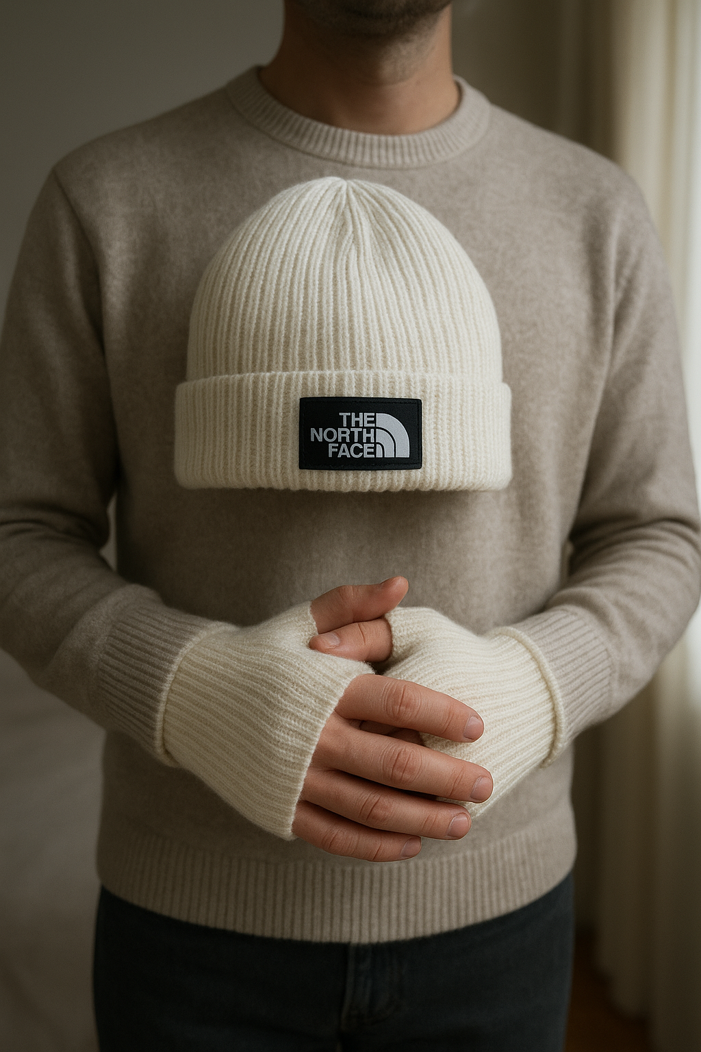Bonnet The North Face Blanc Crème Unisexe debout, face à la caméra, dans une chambre à la lumière douce, avec une lumière naturelle filtrant par la fenêtre.