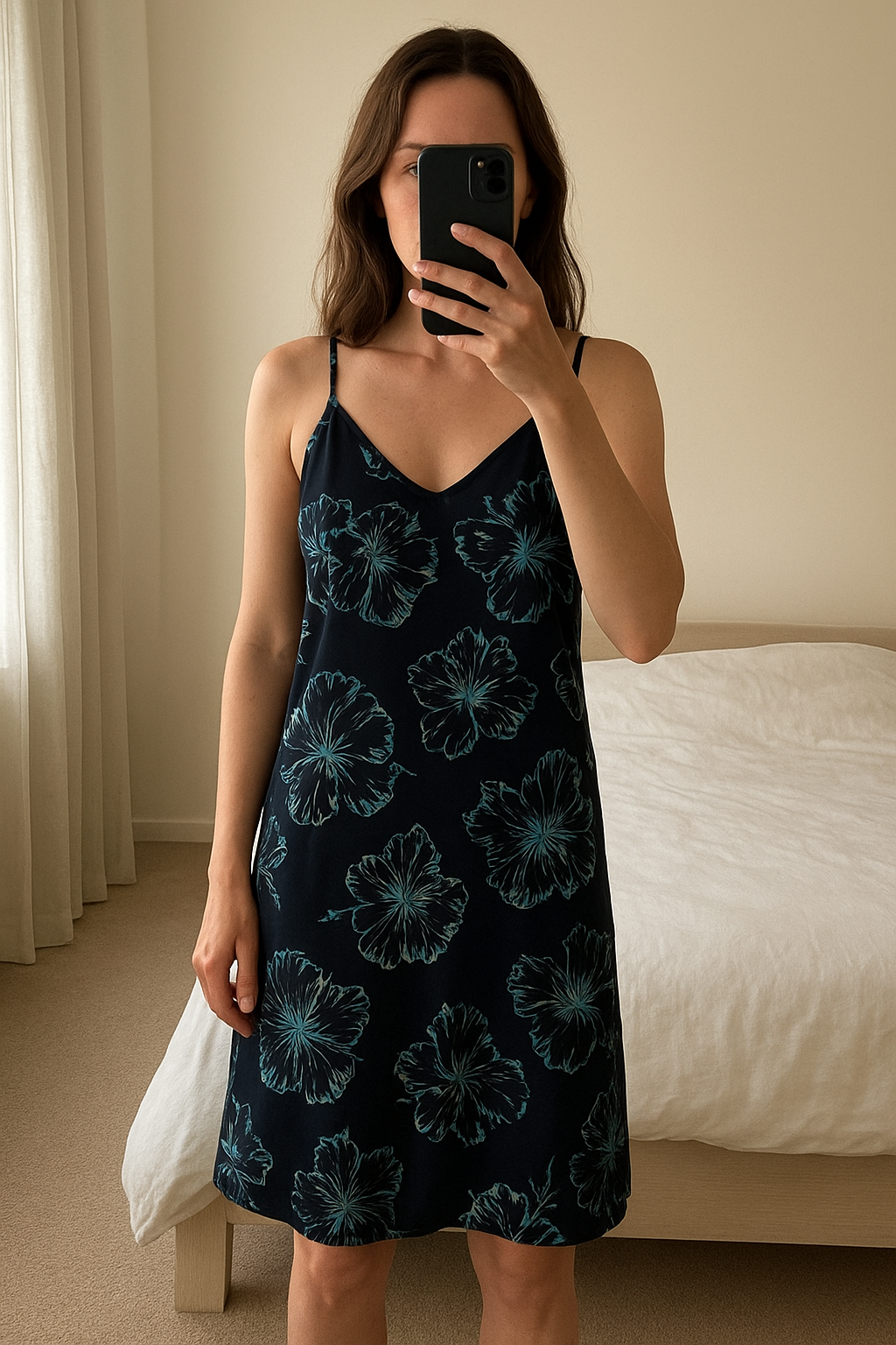 Bonprix swim dress size 18 standing straight facing the camera, in a softly lit bedroom setting, with gentle natural light filtering through a window.