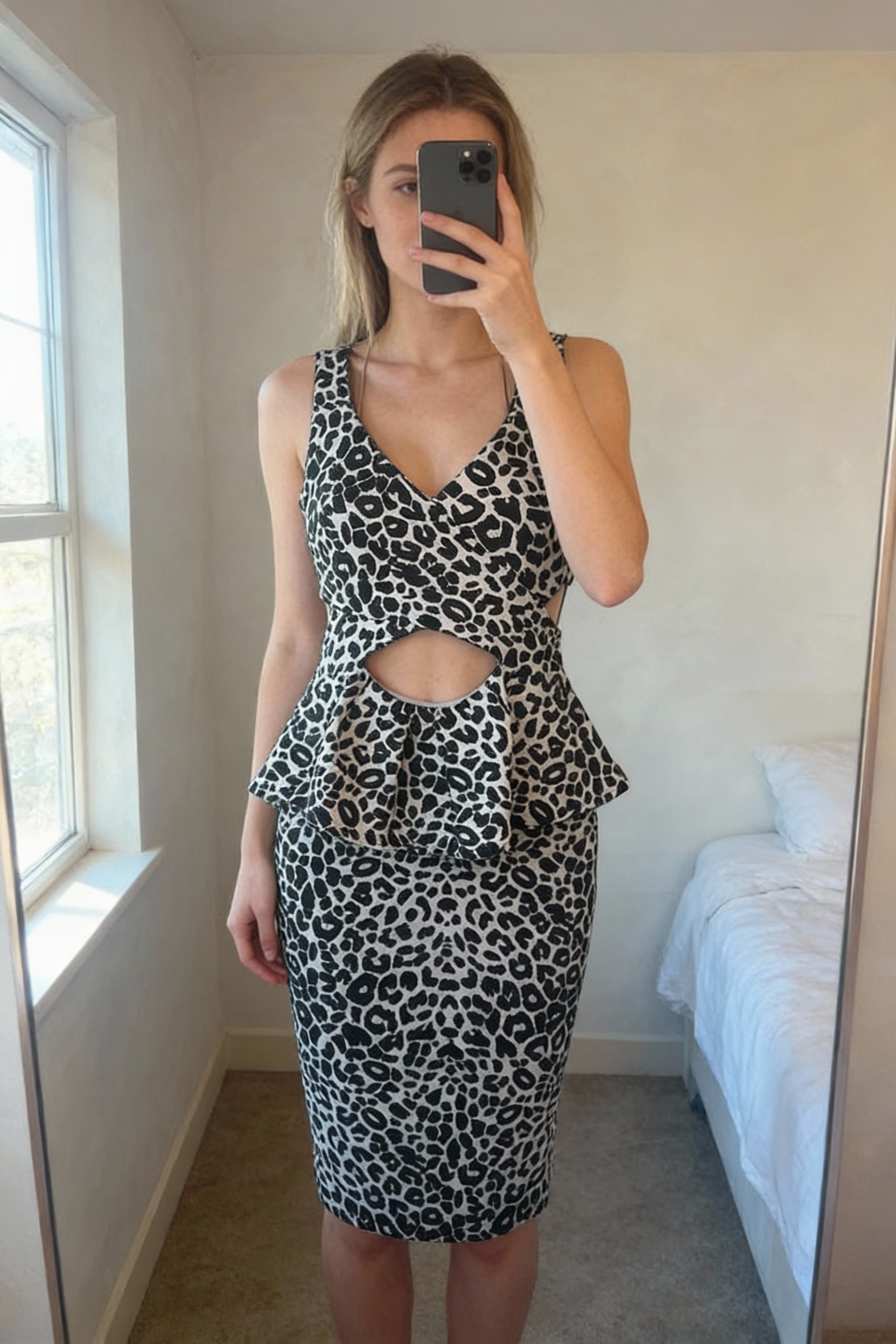 Boohoo Black and Grey White Leopard Plunge Peplum Midi Dress standing straight facing the camera, in a softly lit bedroom setting, with gentle natural light filtering through a window.
