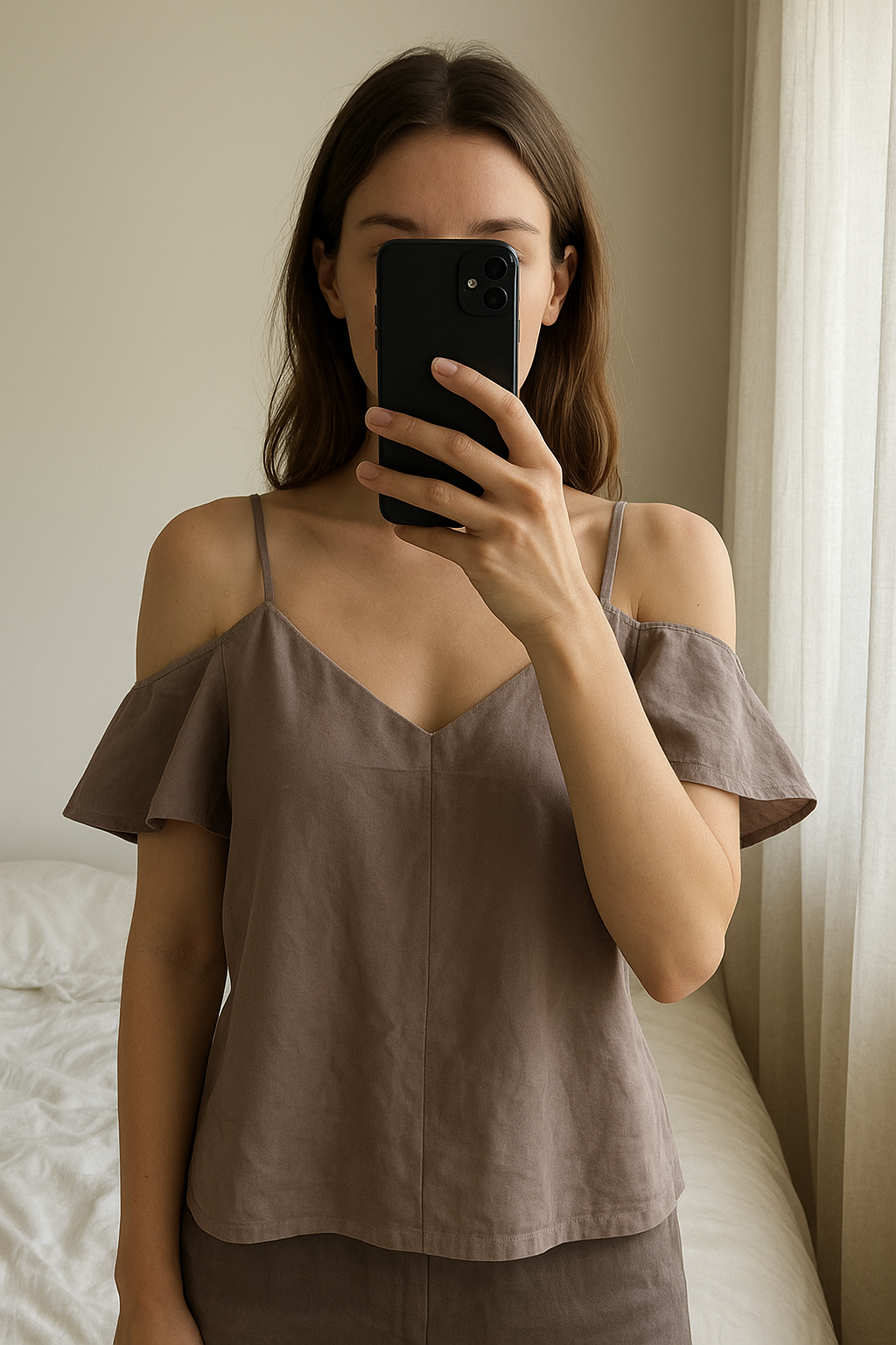 Boohoo off the shoulder blouse standing straight facing the camera, in a softly lit bedroom setting, with gentle natural light filtering through a window.