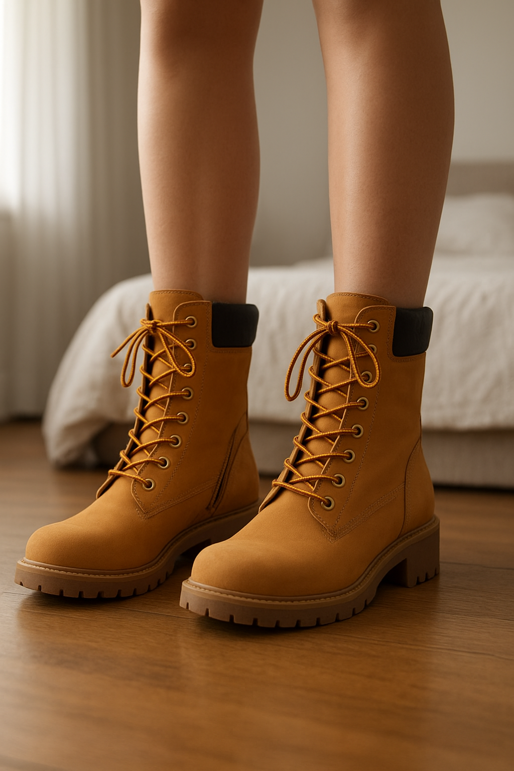 Bottes hautes debout, face à la caméra, dans une chambre à la lumière douce, avec une lumière naturelle filtrant par la fenêtre.