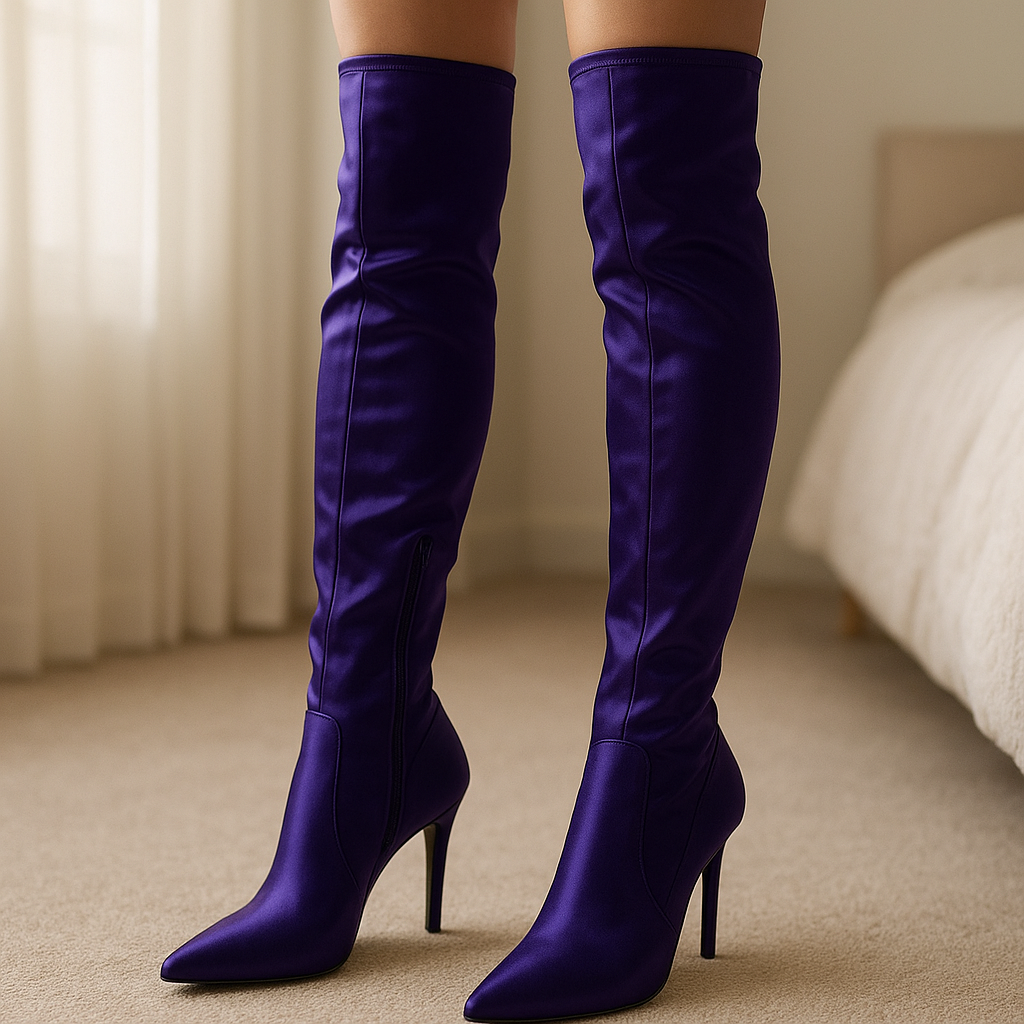 Bottes satin violet debout, face à la caméra, dans une chambre à la lumière douce, avec une lumière naturelle filtrant par la fenêtre.
