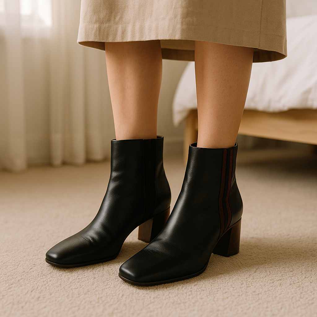 Bottines femme taille 38 debout, face à la caméra, dans une chambre à la lumière douce, avec une lumière naturelle filtrant par la fenêtre.