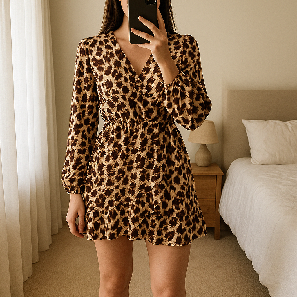 Brand New Animal Print Wrap Style Dress standing straight facing the camera, in a softly lit bedroom setting, with gentle natural light filtering through a window.