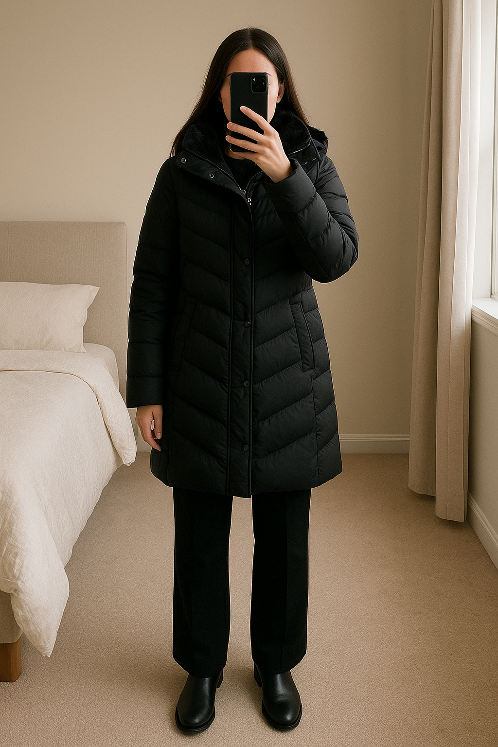 Brand new unworn black thick winter puffer coat size 18 standing straight facing the camera, in a softly lit bedroom setting, with gentle natural light filtering through a window.