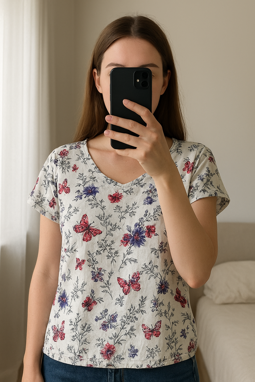 Butterfly, floral T-shirt standing straight facing the camera, in a softly lit bedroom setting, with gentle natural light filtering through a window.