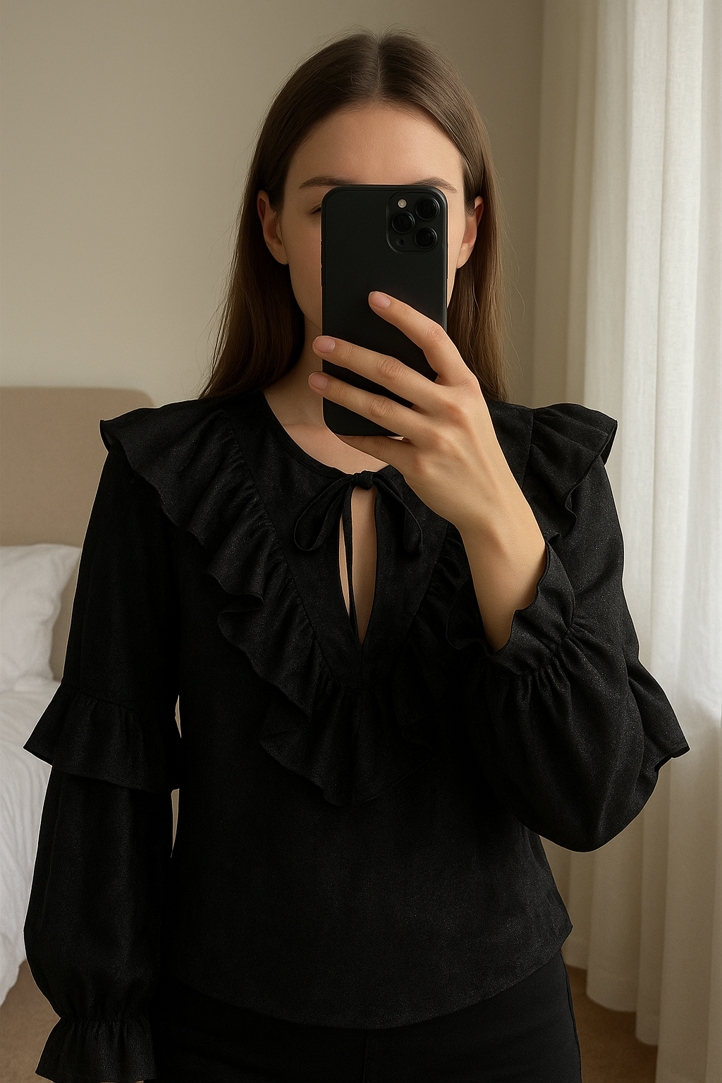 Cămașă Damă cu volane standing straight facing the camera, in a softly lit bedroom setting, with gentle natural light filtering through a window.