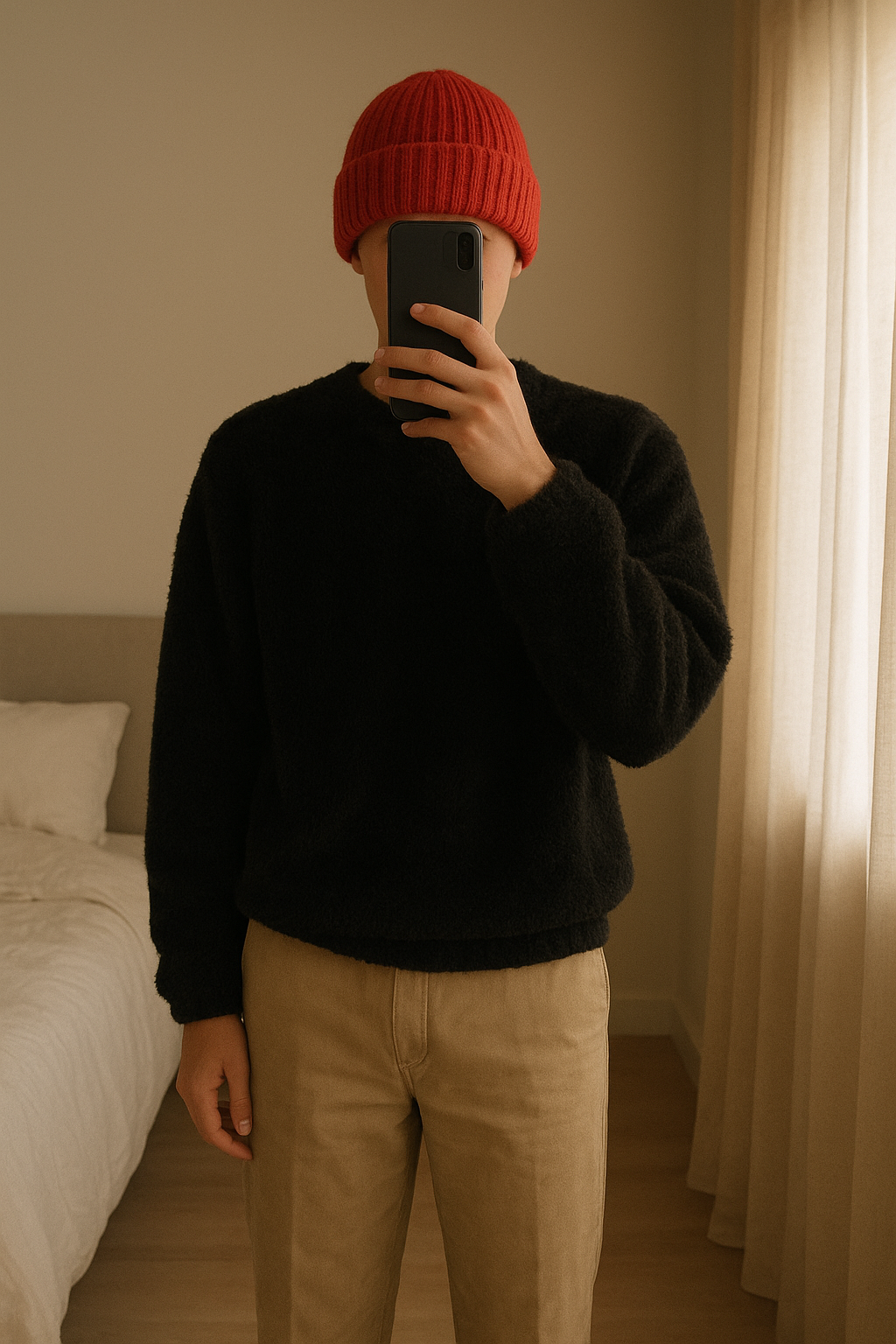 Cache coup- taille unique debout, face à la caméra, dans une chambre à la lumière douce, avec une lumière naturelle filtrant par la fenêtre.