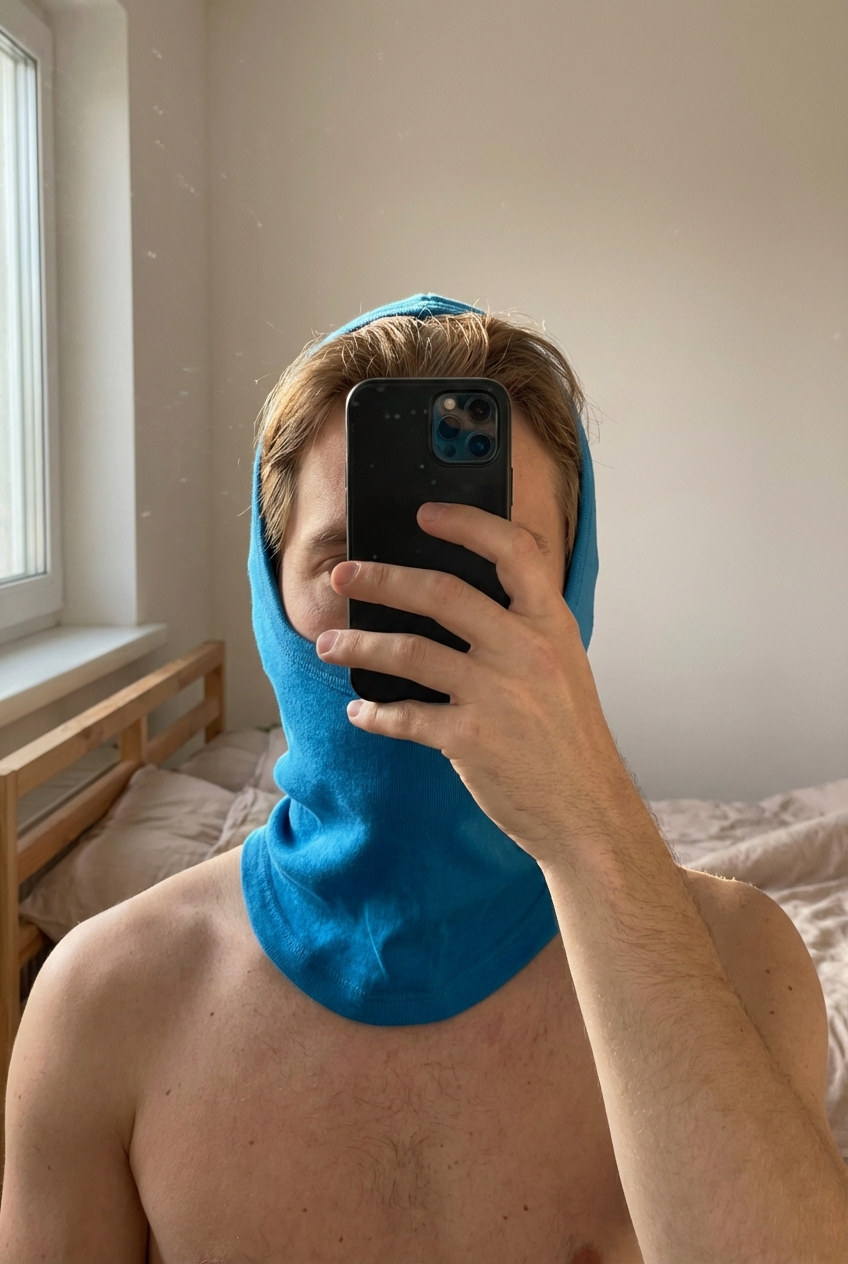Cagoule Karting Homme debout, face à la caméra, dans une chambre à la lumière douce, avec une lumière naturelle filtrant par la fenêtre.