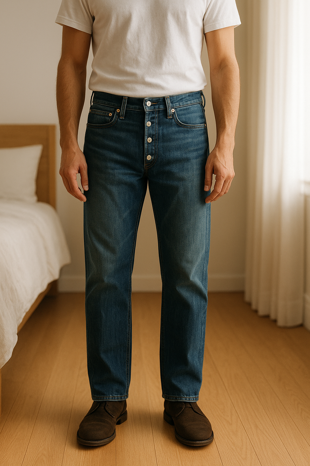 Calças Jeans Levi's 501 debout, face à la caméra, dans une chambre à la lumière douce, avec une lumière naturelle filtrant par la fenêtre.