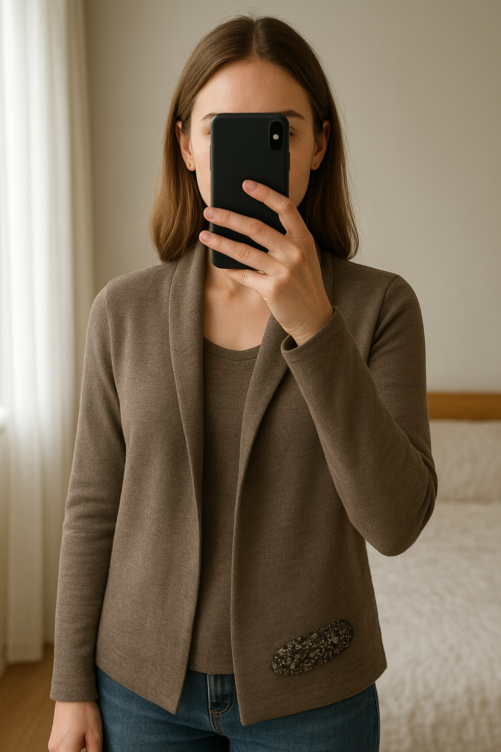 Calliope vesta tanka maslinasta standing straight facing the camera, in a softly lit bedroom setting, with gentle natural light filtering through a window.