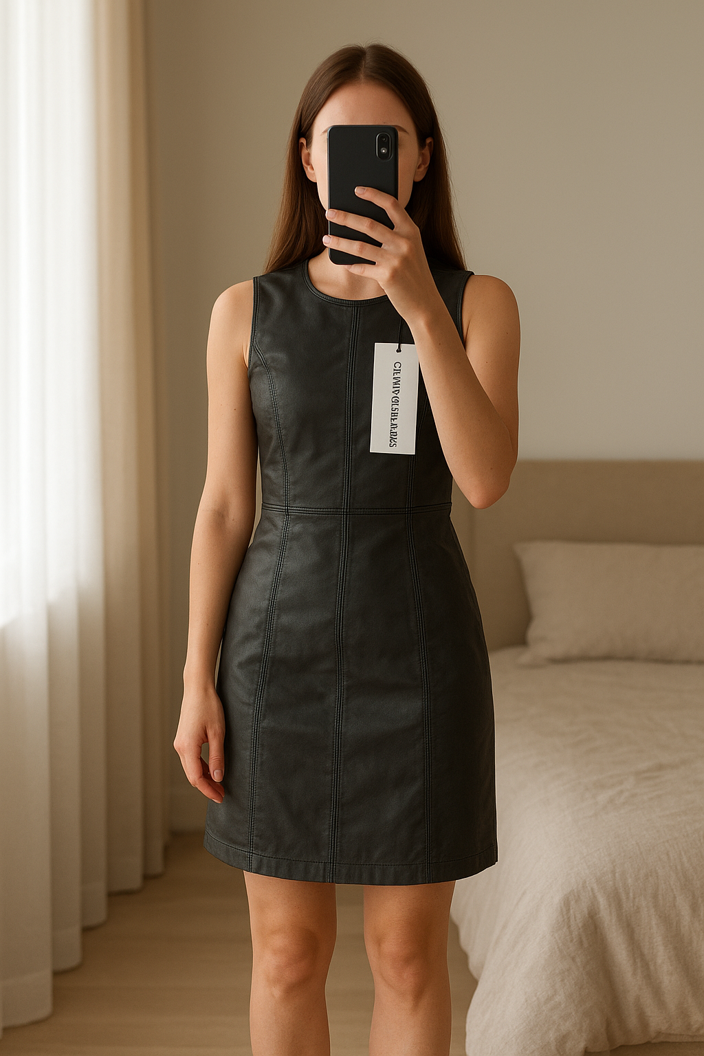 Calvin Klein Robe Débardeur Noire XS Neuve Simili Cuir Enduit Cintrée Stretch debout, face à la caméra, dans une chambre à la lumière douce, avec une lumière naturelle filtrant par la fenêtre.