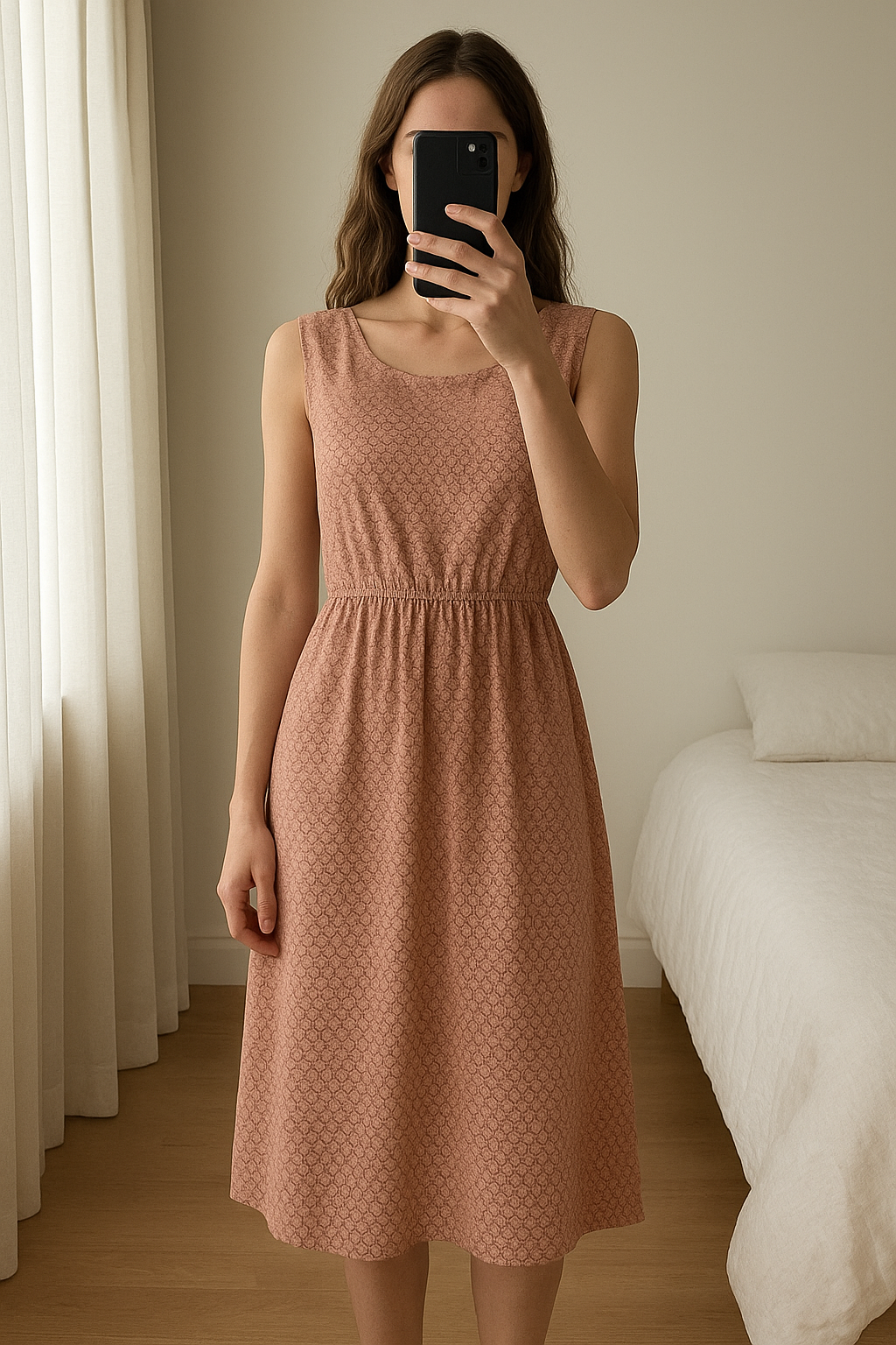 Cameo Rose summer shift butterfly dress size medium/10 standing straight facing the camera, in a softly lit bedroom setting, with gentle natural light filtering through a window.