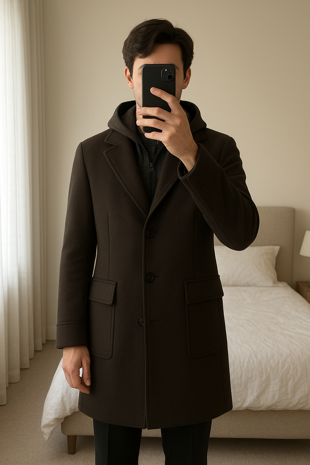Cappotto verde/marrone sartoriale in lana e cashmere in piedi, rivolto verso la fotocamera, in una camera da letto con luce soffusa e luce naturale che filtra dalla finestra.