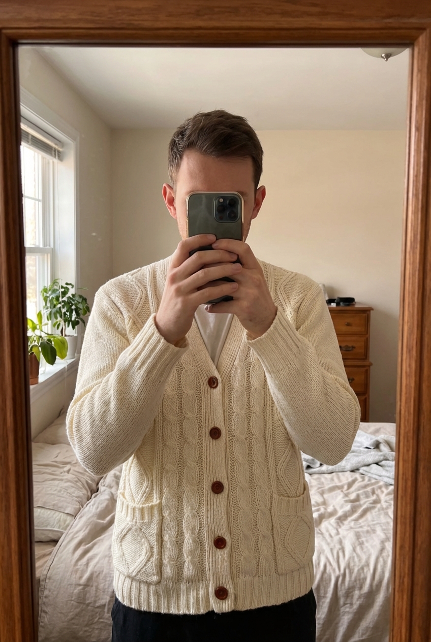 Cardigan Fait Main Tricot Aran Sweater 100% Acrylique Beige Crème Aran Craft M debout, face à la caméra, dans une chambre à la lumière douce, avec une lumière naturelle filtrant par la fenêtre.