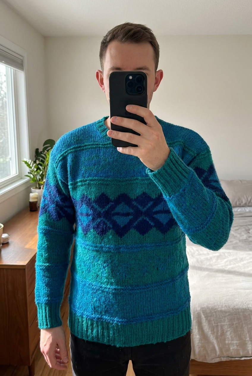 Cardigan Fait Main Tricot Aran Sweater 100% Acrylique Bleu Vert Vintage M debout, face à la caméra, dans une chambre à la lumière douce, avec une lumière naturelle filtrant par la fenêtre.