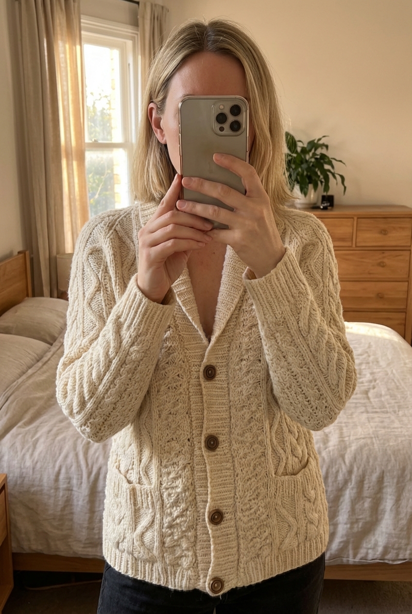 Cardigan Fait Main Tricot Aran Wool Sweater 100% Laine Beige Crème Aran Crafts S debout, face à la caméra, dans une chambre à la lumière douce, avec une lumière naturelle filtrant par la fenêtre.