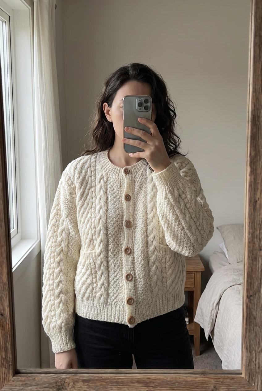 Cardigan Fait Main Tricot Aran Wool Sweater 100% Laine Blanc Crème Aran Crafts XL debout, face à la caméra, dans une chambre à la lumière douce, avec une lumière naturelle filtrant par la fenêtre.