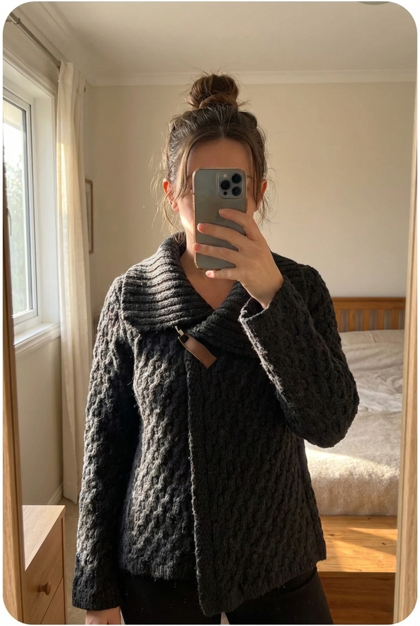 Cardigan Fait Main Tricot Aran Wool Sweater 100% Laine Noir Aran Crafts S debout, face à la caméra, dans une chambre à la lumière douce, avec une lumière naturelle filtrant par la fenêtre.