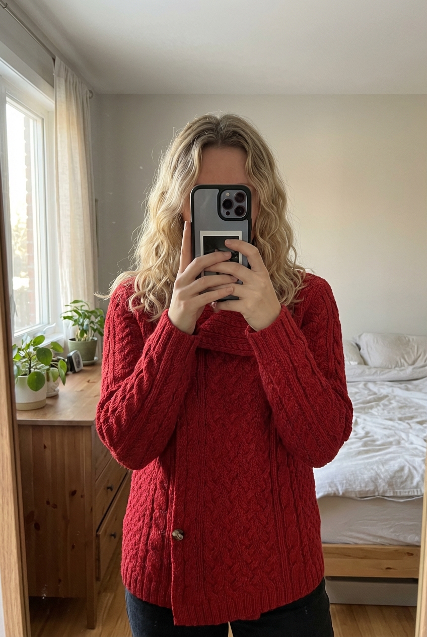 Cardigan Fait Main Tricot Aran Wool Sweater 100% Laine Rouge Aran Craft L debout, face à la caméra, dans une chambre à la lumière douce, avec une lumière naturelle filtrant par la fenêtre.