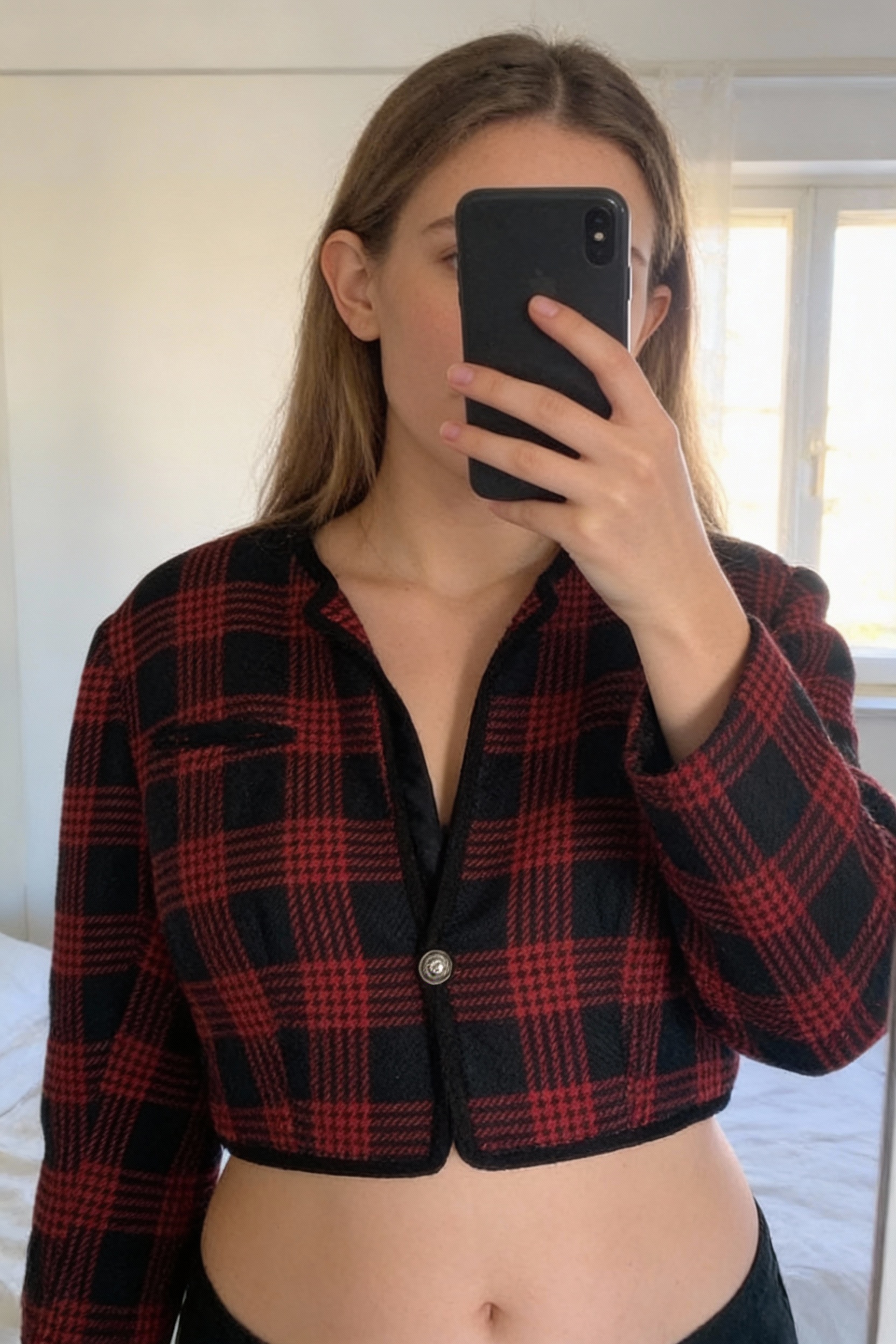 Une personne en Cardigan / gilet court / crop top debout, face à la caméra, avec une silhouette légèrement plus ronde, dans une chambre à la lumière douce, avec une lumière naturelle filtrant par la fenêtre.