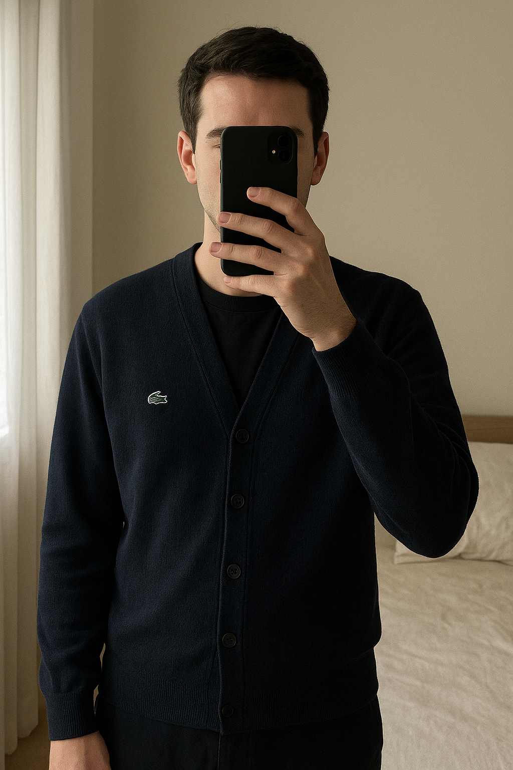 Cardigan Lacoste noir – Taille L – 100 % laine – Made in Italy debout, face à la caméra, dans une chambre à la lumière douce, avec une lumière naturelle filtrant par la fenêtre.