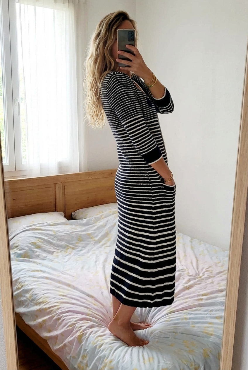 Une personne en Cardigan Maje long rayé marine et blanc T1 neuf cambrant légèrement le dos pour une pose dynamique, dans une chambre à la lumière douce, avec une lumière naturelle filtrant par la fenêtre.