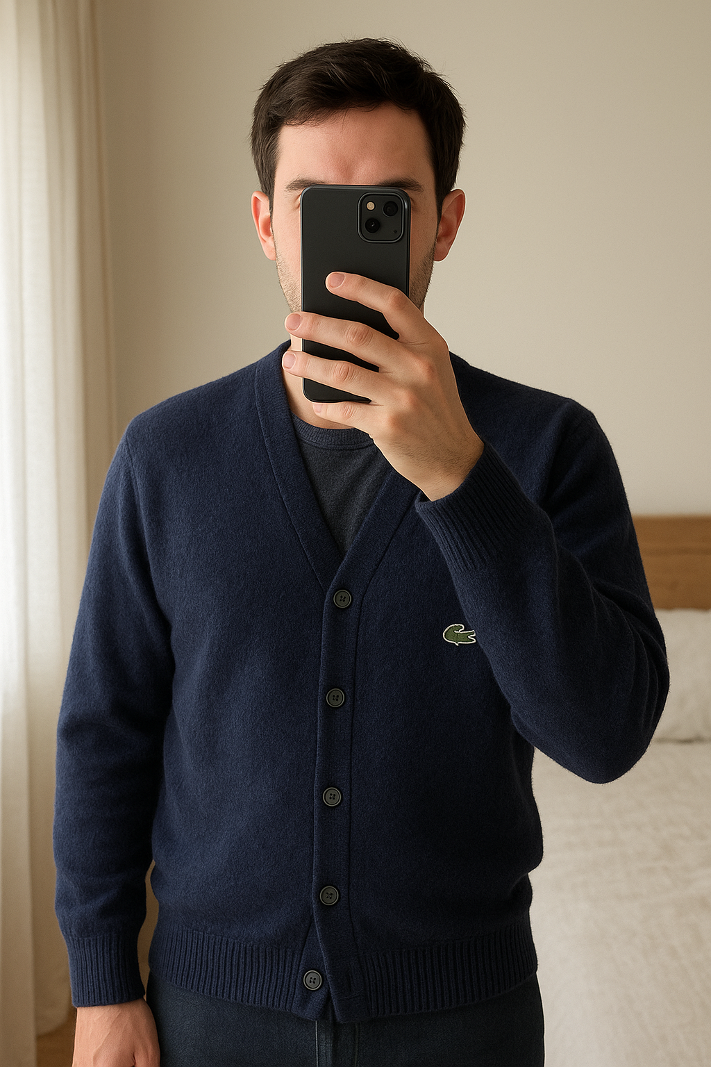 Cardigans Lacoste Bleu Marine Homme - Taille M debout, face à la caméra, dans une chambre à la lumière douce, avec une lumière naturelle filtrant par la fenêtre.