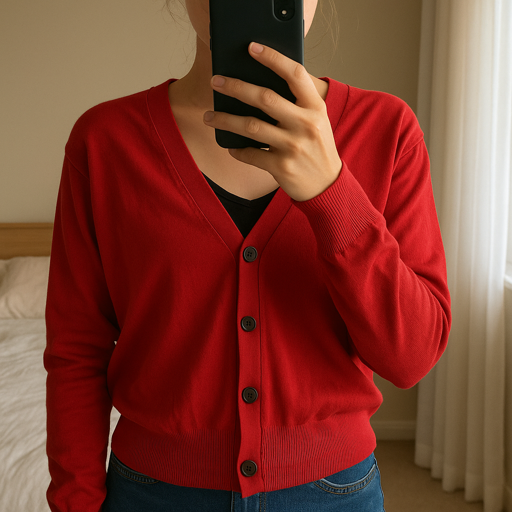 Cardigans Meimeij Taille 40 debout, face à la caméra, dans une chambre à la lumière douce, avec une lumière naturelle filtrant par la fenêtre.