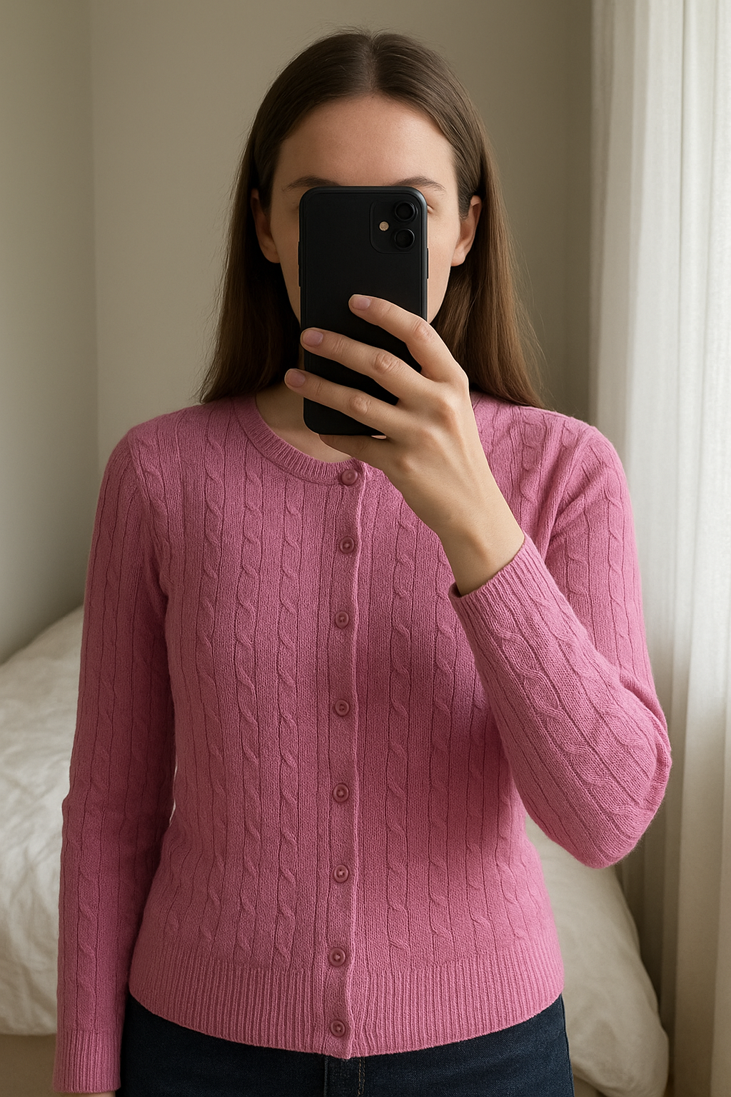 Cardigans Rose Merona Femme - Taille S debout, face à la caméra, dans une chambre à la lumière douce, avec une lumière naturelle filtrant par la fenêtre.