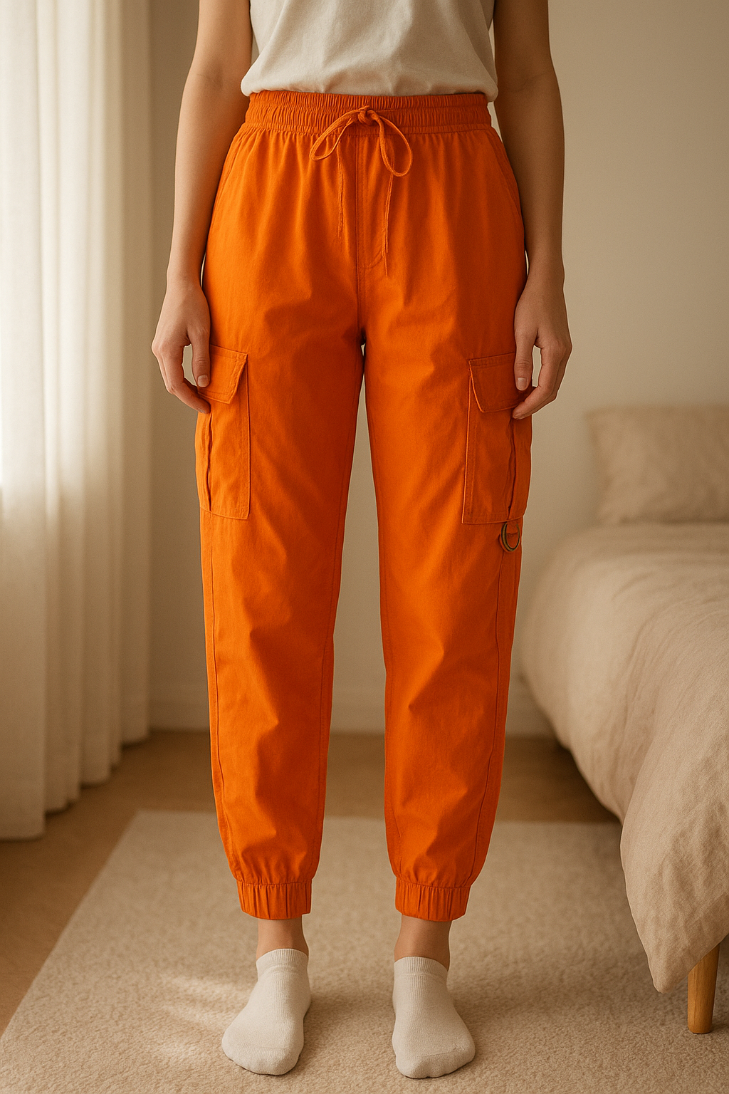 Cargo orange fluide taille 38 debout, face à la caméra, dans une chambre à la lumière douce, avec une lumière naturelle filtrant par la fenêtre.