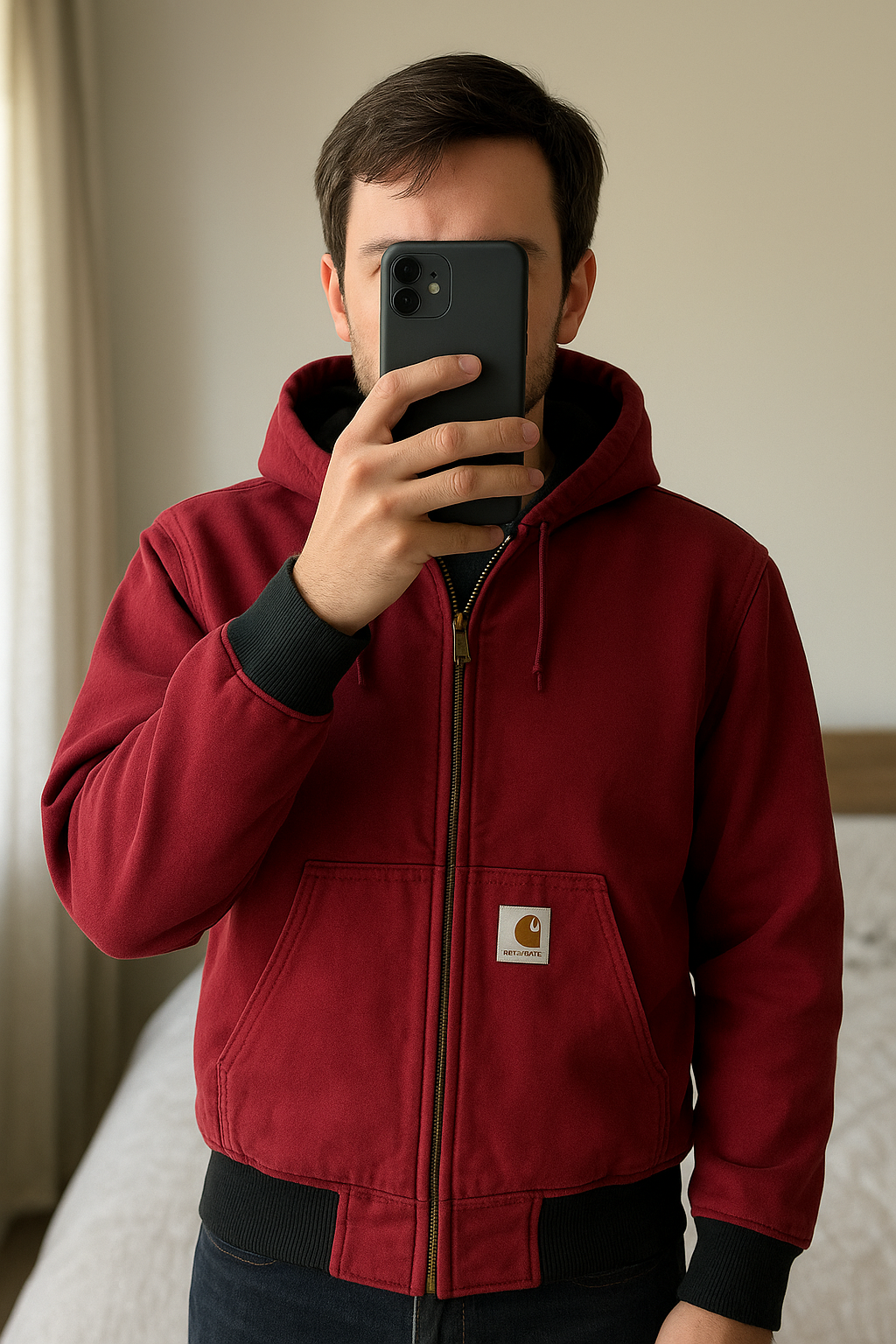 Carhartt Red Jacket S standing straight facing the camera, in a softly lit bedroom setting, with gentle natural light filtering through a window.