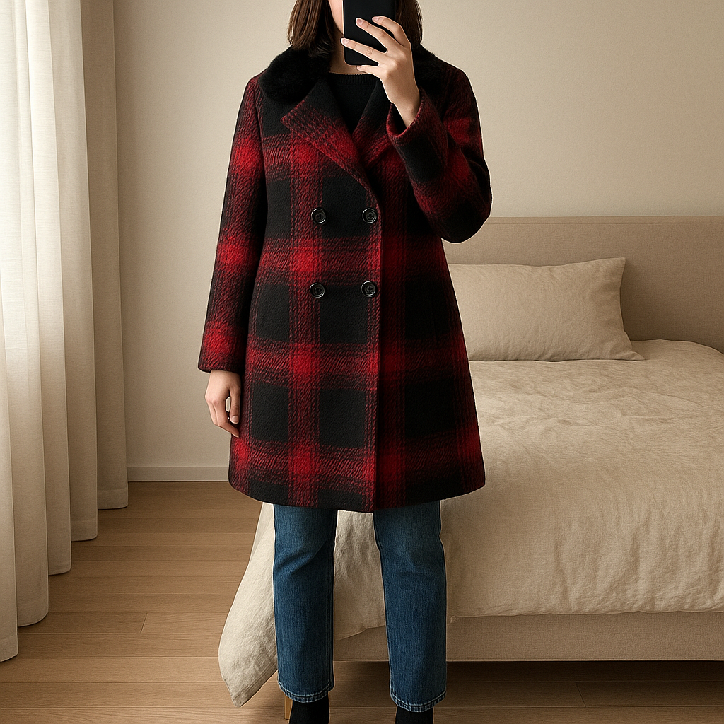 Casaco comprido da Mango em pé, de frente para a câmera, em um quarto com iluminação suave e luz natural filtrando pela janela.