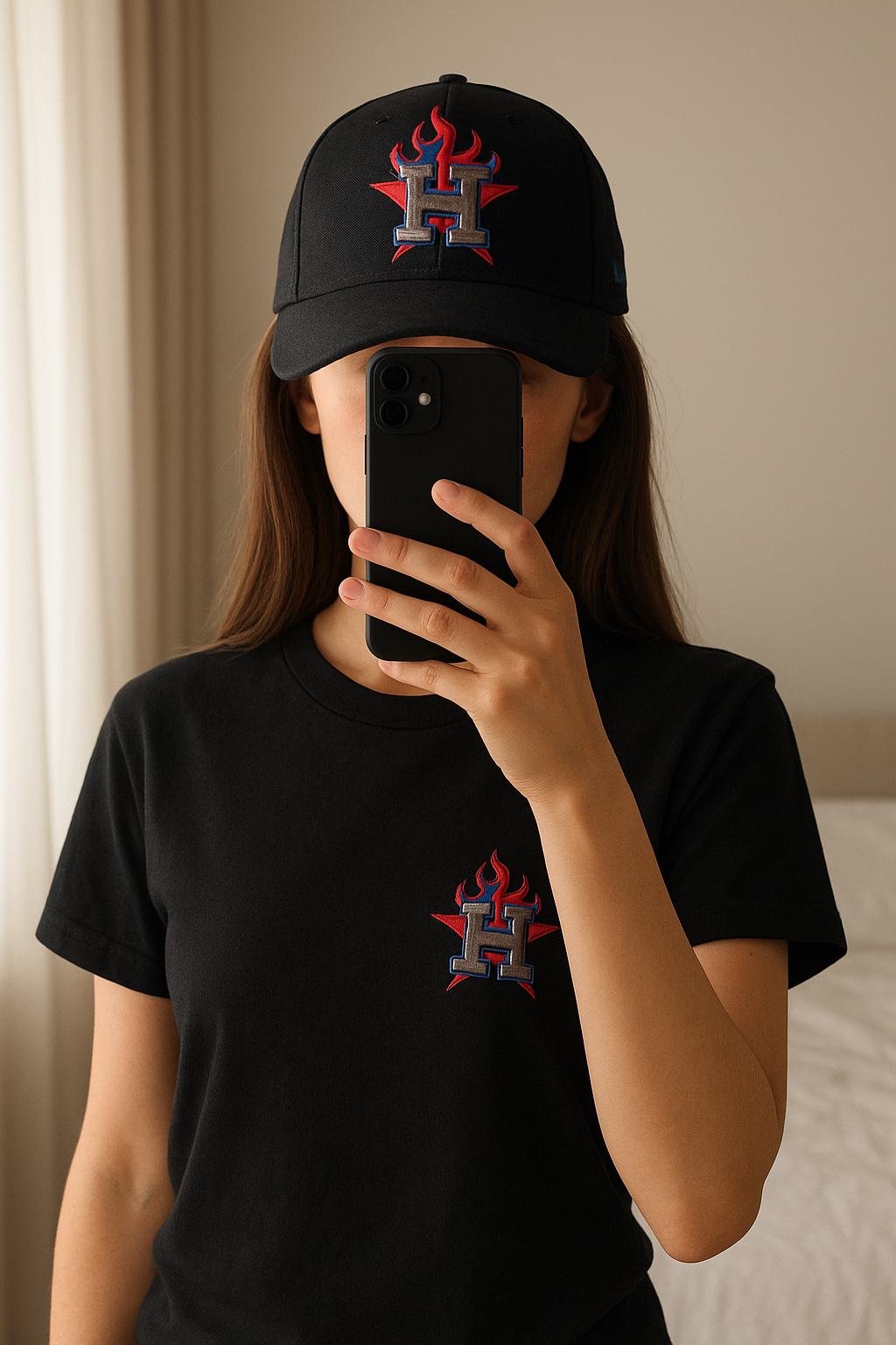 Casquette Houston Astros debout, face à la caméra, dans une chambre à la lumière douce, avec une lumière naturelle filtrant par la fenêtre.