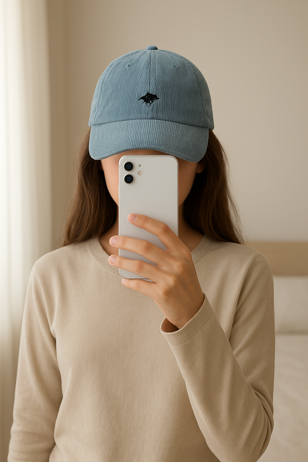 Casquette US athletic original en velours neuf avec étiquette debout, face à la caméra, dans une chambre à la lumière douce, avec une lumière naturelle filtrant par la fenêtre.