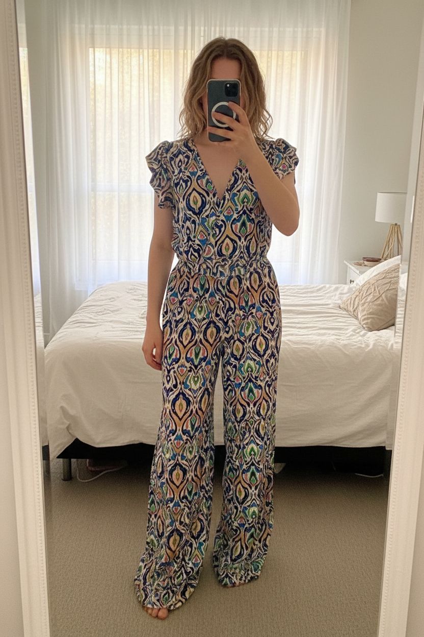 Cerulean Debenhams Jumpsuit UK L Ikat Print Wide Leg Holiday Festival Colourful standing straight facing the camera, in a softly lit bedroom setting, with gentle natural light filtering through a window.