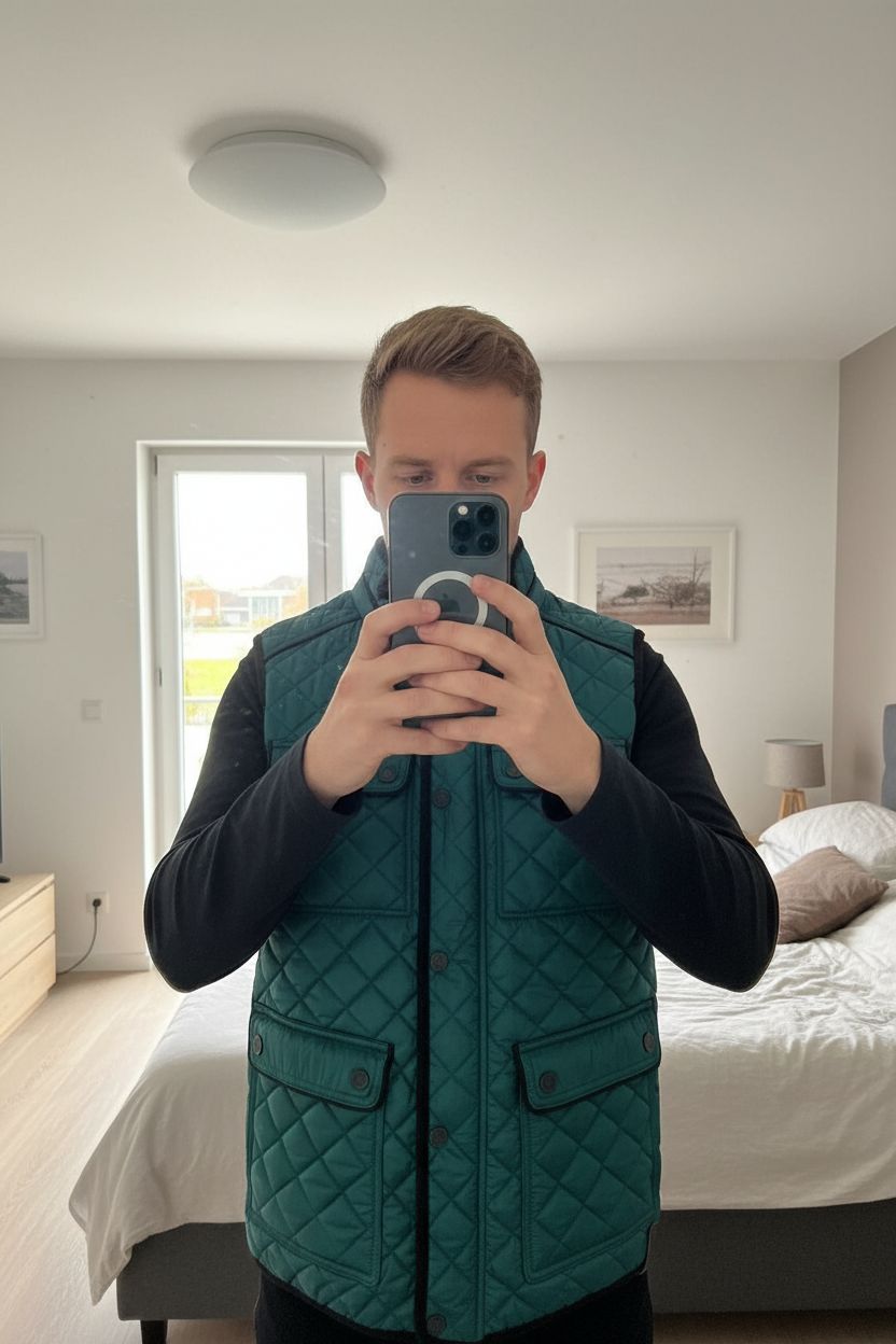 chaleco hombre S verde easy wear de pie, mirando a la cámara, en un dormitorio con luz suave y natural filtrándose por la ventana.