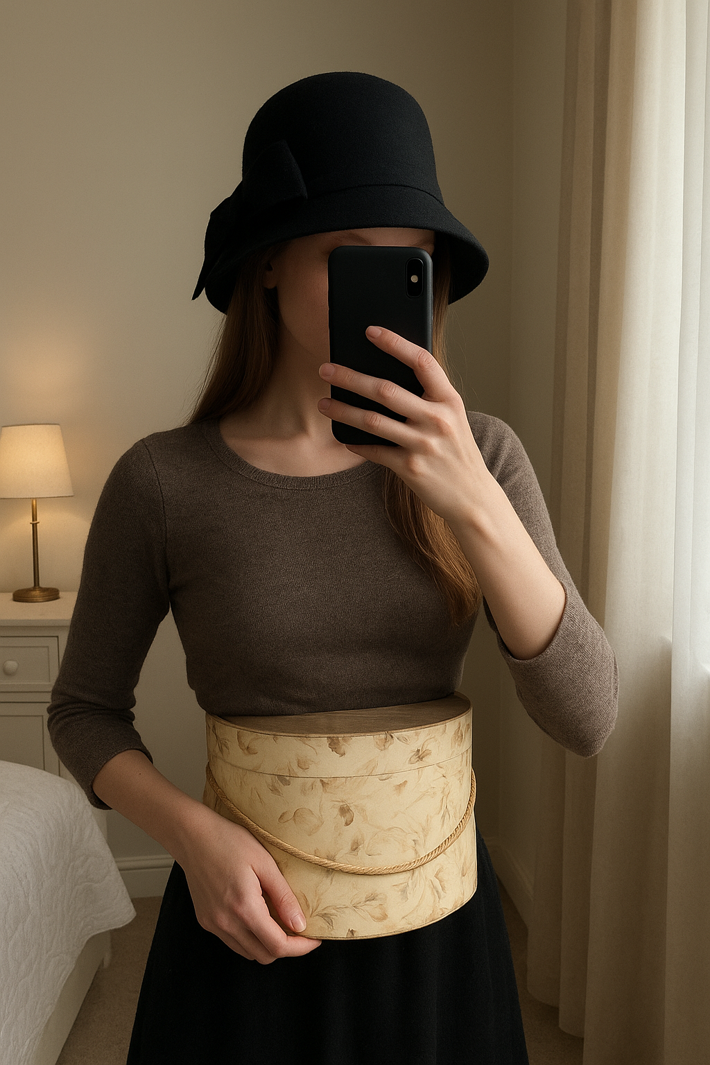 Une personne en Chapeau femme vintage feutre cambrant légèrement le dos pour une pose dynamique, dans une chambre à la lumière douce, avec une lumière naturelle filtrant par la fenêtre.