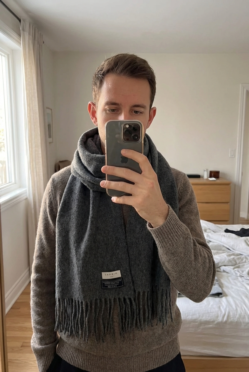 Écharpe Sandro debout, face à la caméra, dans une chambre à la lumière douce, avec une lumière naturelle filtrant par la fenêtre.