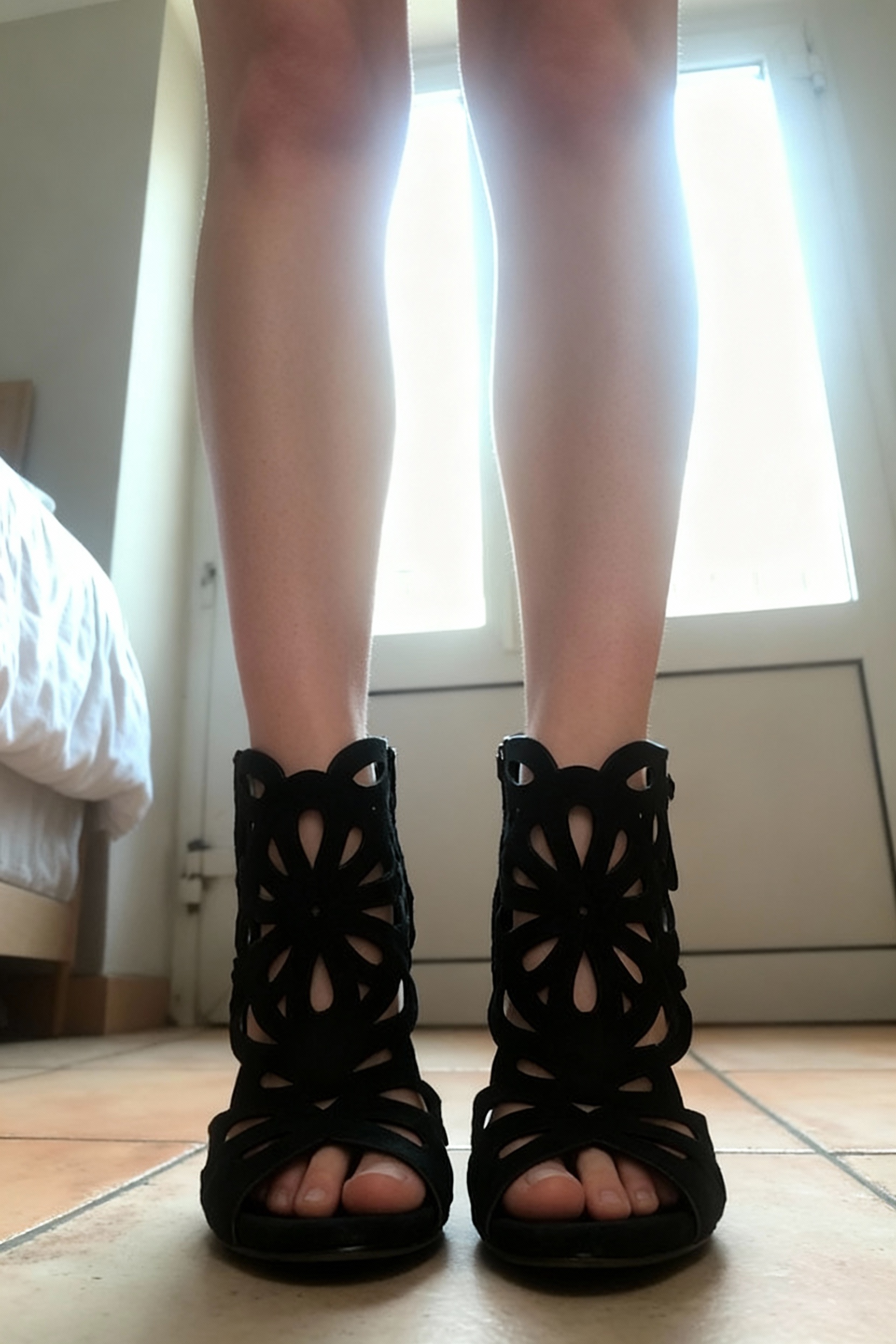 Chaussure nue pied debout, face à la caméra, dans une chambre à la lumière douce, avec une lumière naturelle filtrant par la fenêtre.