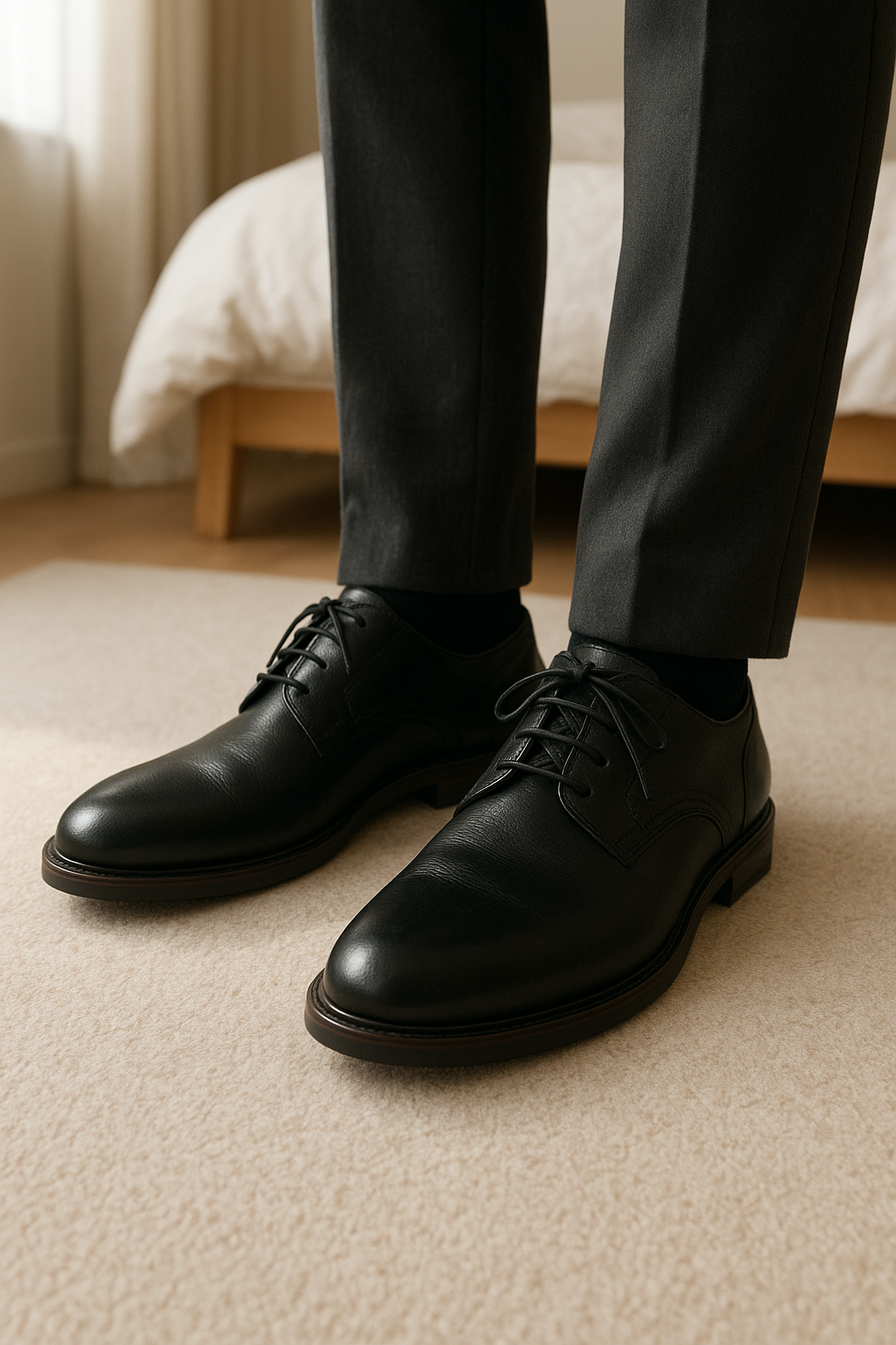 Chaussures debout, face à la caméra, dans une chambre à la lumière douce, avec une lumière naturelle filtrant par la fenêtre.