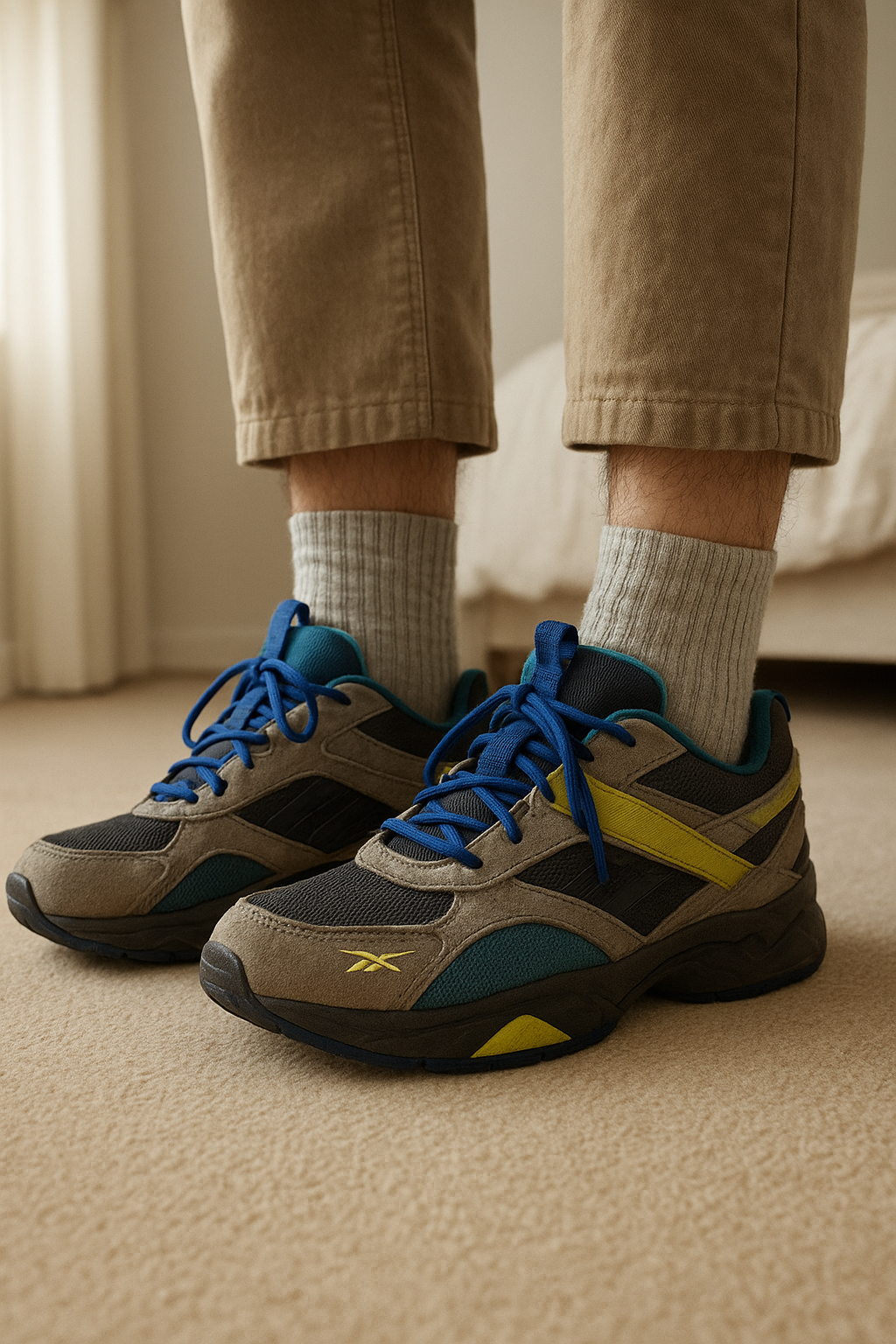 Chaussures baskets scarpe Sneakers Reebok Aztrej 96 Adventure in piedi, rivolto verso la fotocamera, in una camera da letto con luce soffusa e luce naturale che filtra dalla finestra.