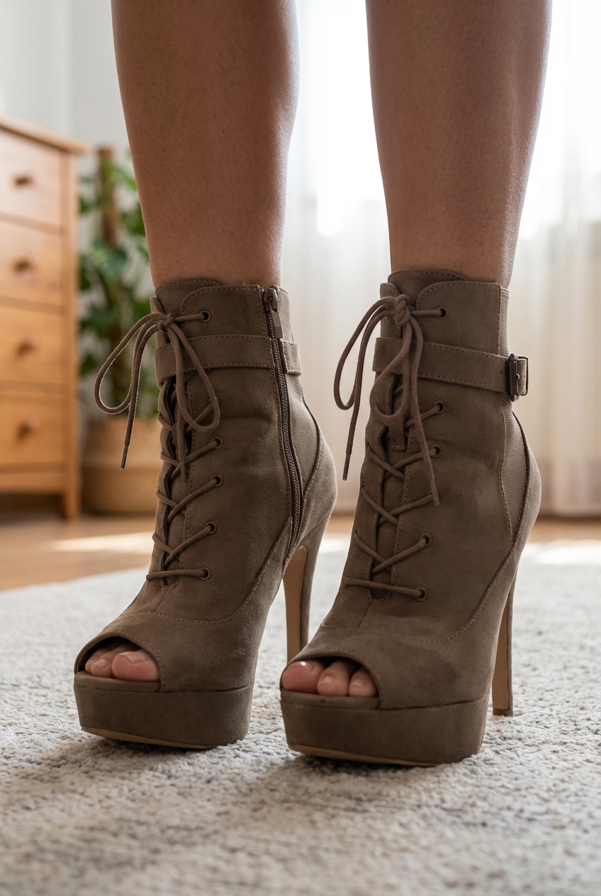 Une personne en Chaussures à plateforme Kaki très bonne état 14cm debout, face à la caméra, dans une chambre à la lumière douce, avec une lumière naturelle filtrant par la fenêtre.